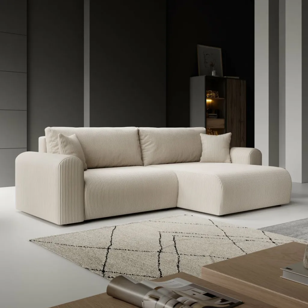 De Marcelli hoekbank is uitgevoerd in een beige ribstof en heeft een moderne vormgeving met afgeronde armleuningen. De bank biedt een comfortabele zitplaats voor drie personen en past dankzij het neutrale kleurgebruik in verschillende interieurstijlen. Bij dit model bevindt de chaise longue zich aan de rechterkant.