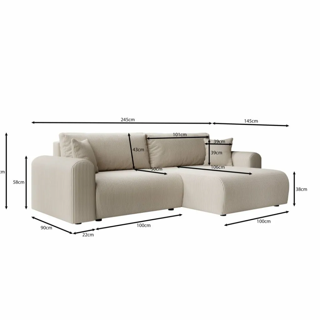 Met een totale breedte van ongeveer 245 cm en een diepte van 90 cm biedt de bank voldoende zitruimte. De chaise longue heeft een diepte van circa 145 cm en is geschikt om languit te zitten of te liggen. De zithoogte bedraagt ongeveer 38 cm en de totale hoogte van de bank is circa 82 cm.