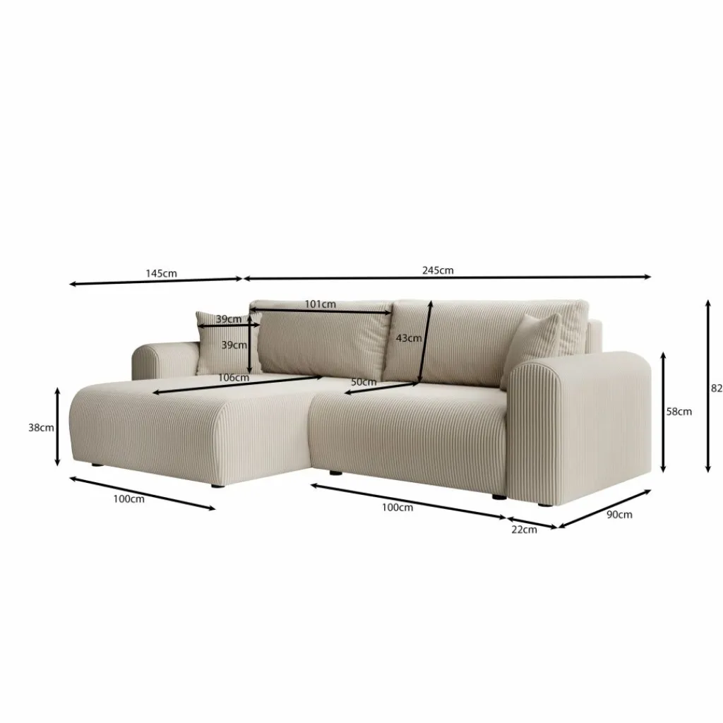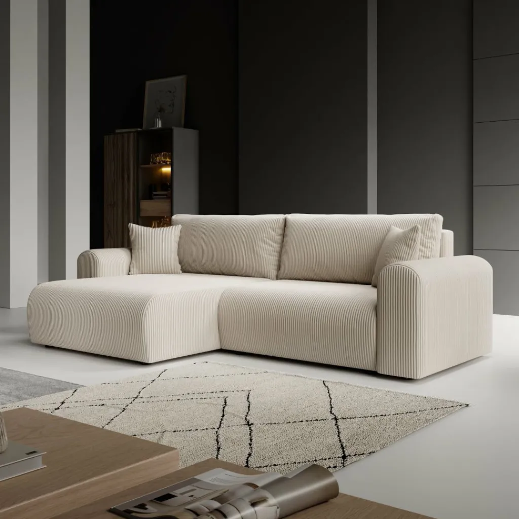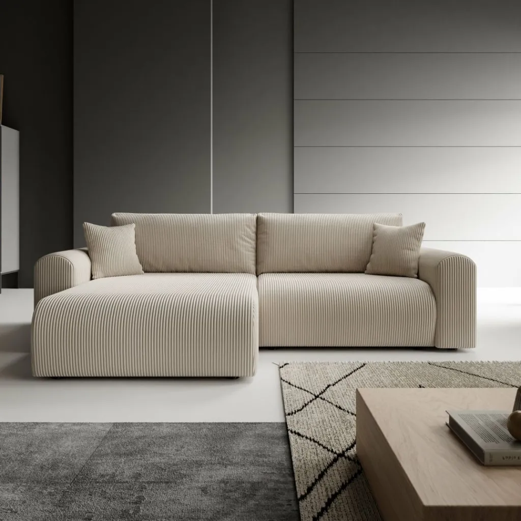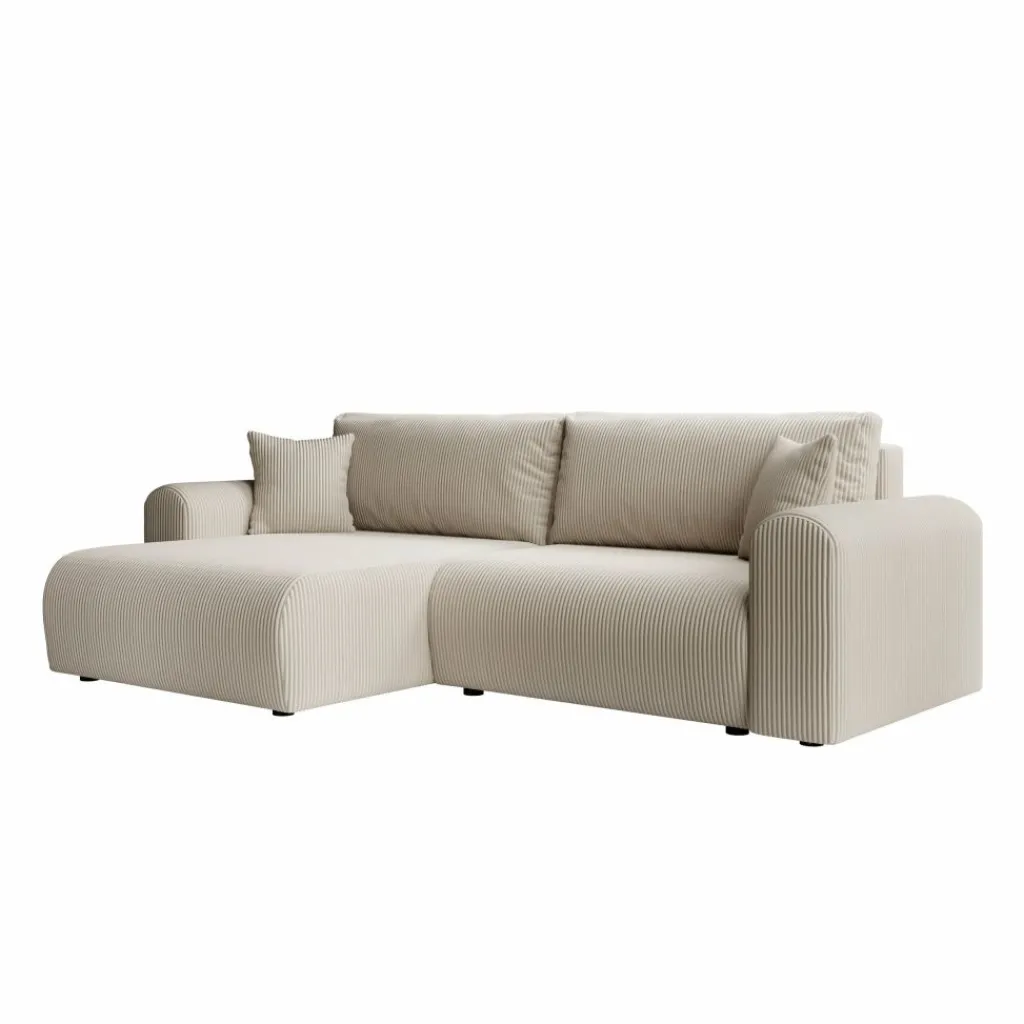 De Marcelli hoekbank is uitgevoerd in een beige ribstof en heeft een moderne, afgeronde vormgeving. Dankzij de brede armleuningen en de zachte lijnen heeft de bank een rustige uitstraling die goed past in verschillende woonstijlen. De chaise longue bevindt zich aan de linkerkant, waardoor je extra zit- en ligruimte creëert.