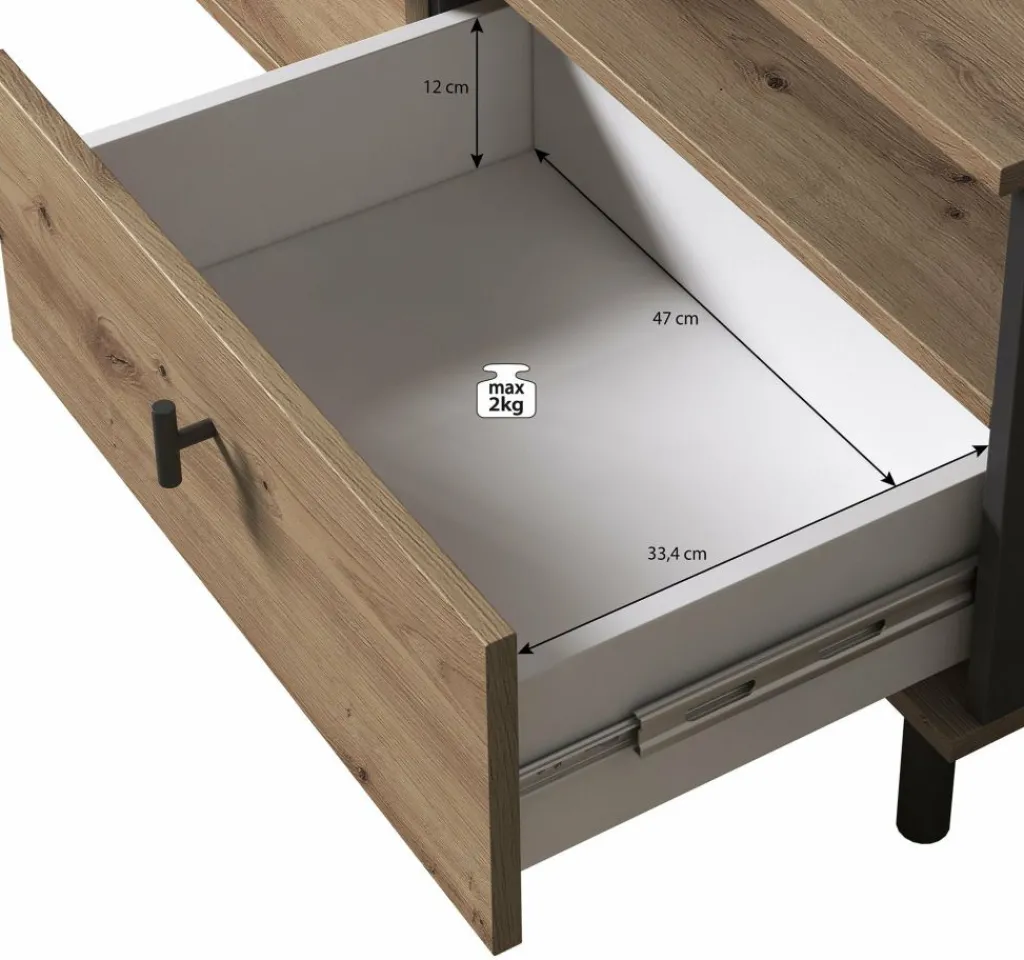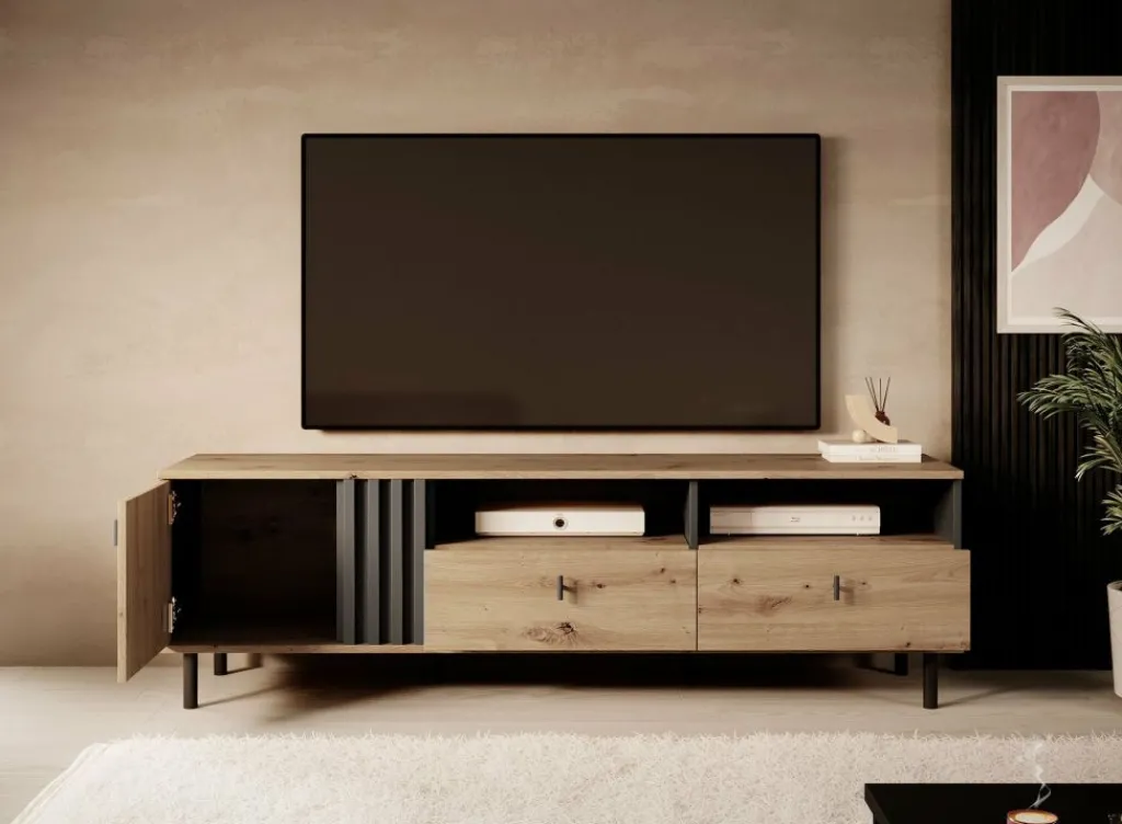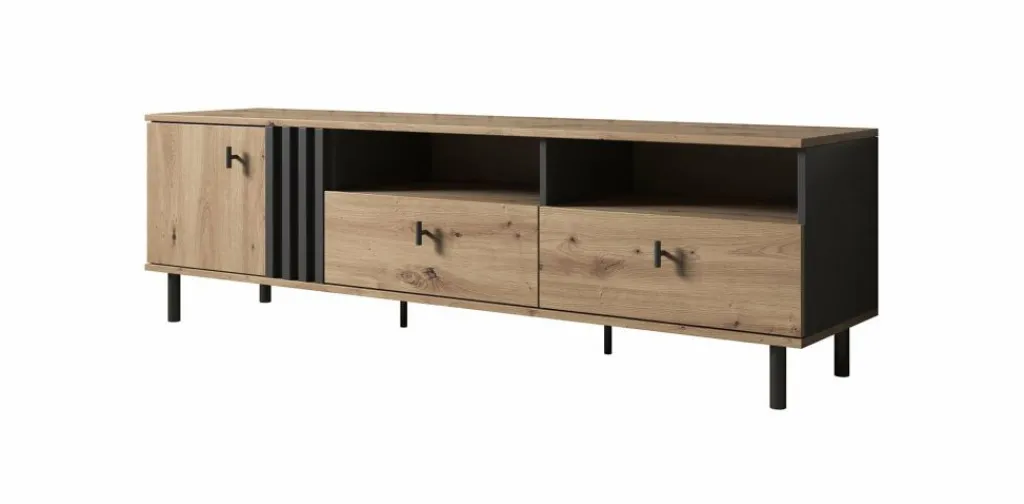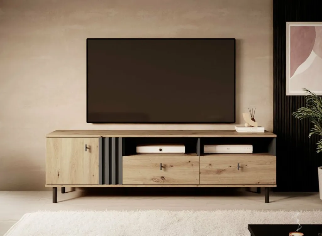 Tv-meubel Marcos is een praktisch vormgegeven dressoir met handige opbergmogelijkheden. Het tv-meubel beschikt over een opbergvak welke af te sluiten is met een klepdeur. Rechts bevinden zich twee open schappen, geschikt voor receivers. Daaronder zitten twee handige opberglades.