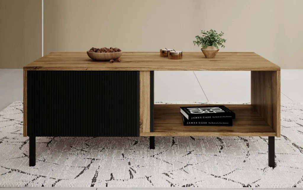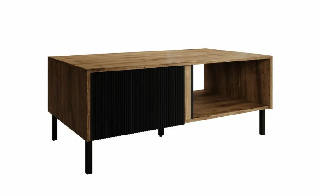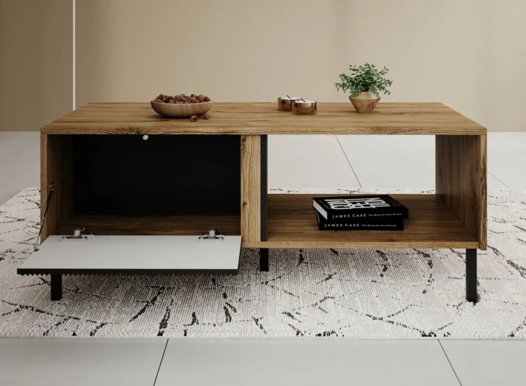 Salontafel Margareth is een rechthoekige salontafel met een moderne uitstraling. De tafel beschikt over 2 kleppen die op de voorkant een latten patroon hebben. De kleppen zijn te openen met het push to open systeem. Daarnaast zit een groot open vak. Het meubel staat op metalen pootjes. De Margareth is uitgevoerd in een eiken kleur met zwart.