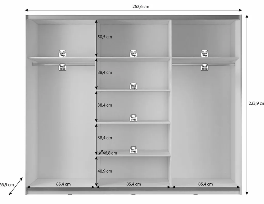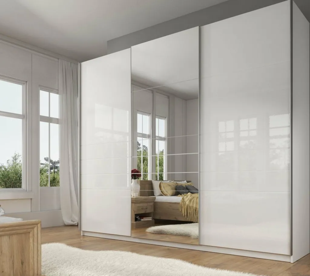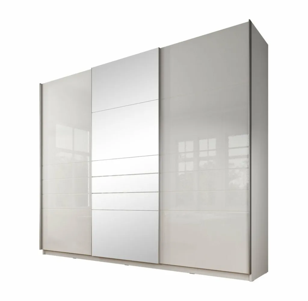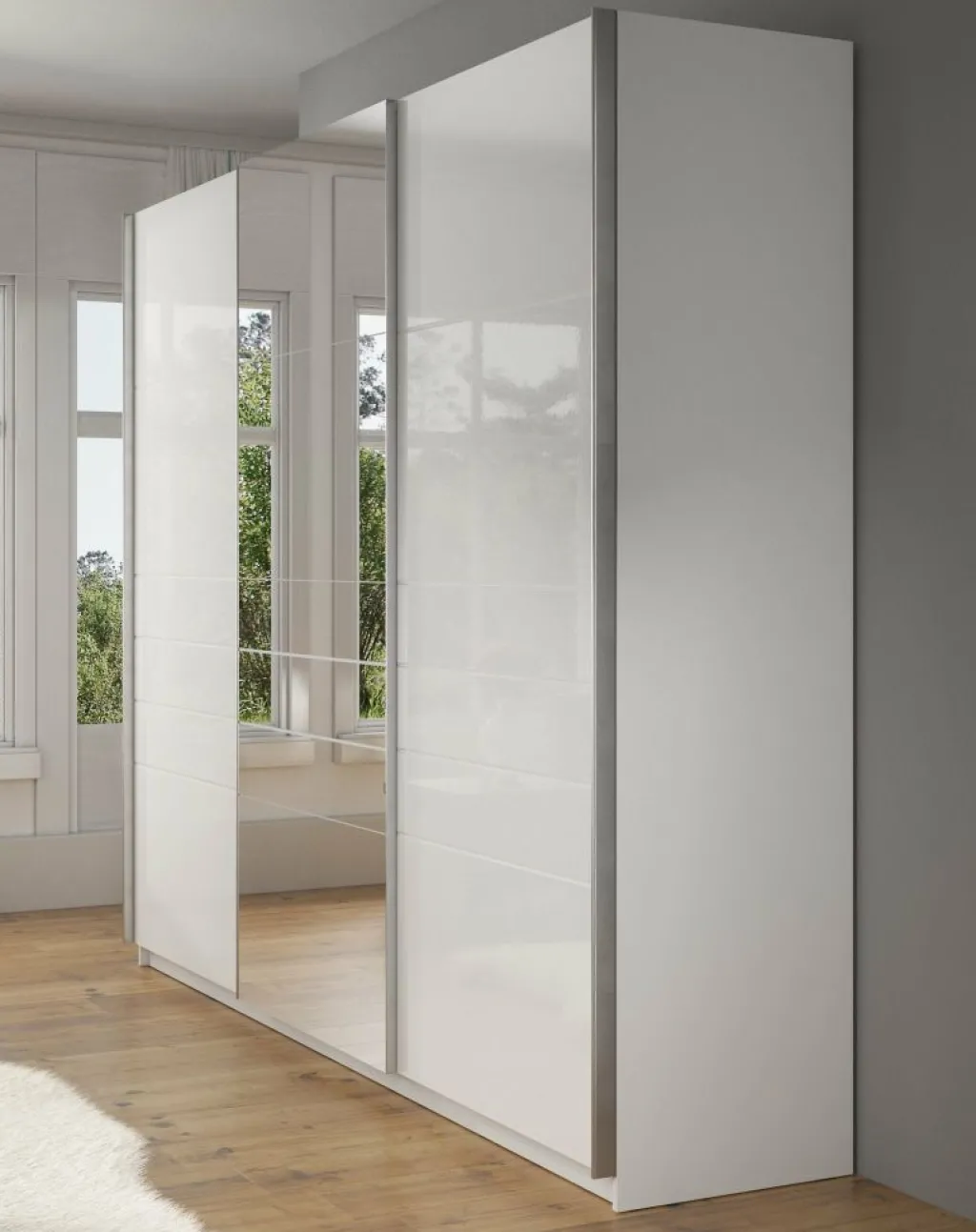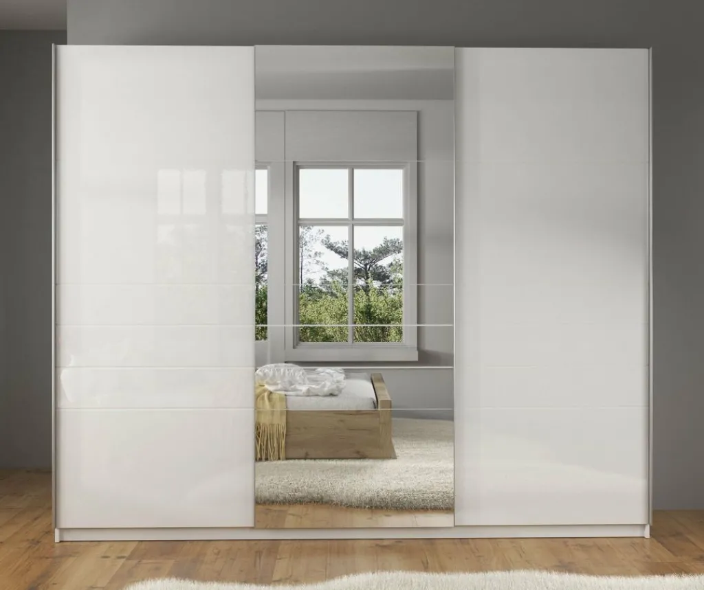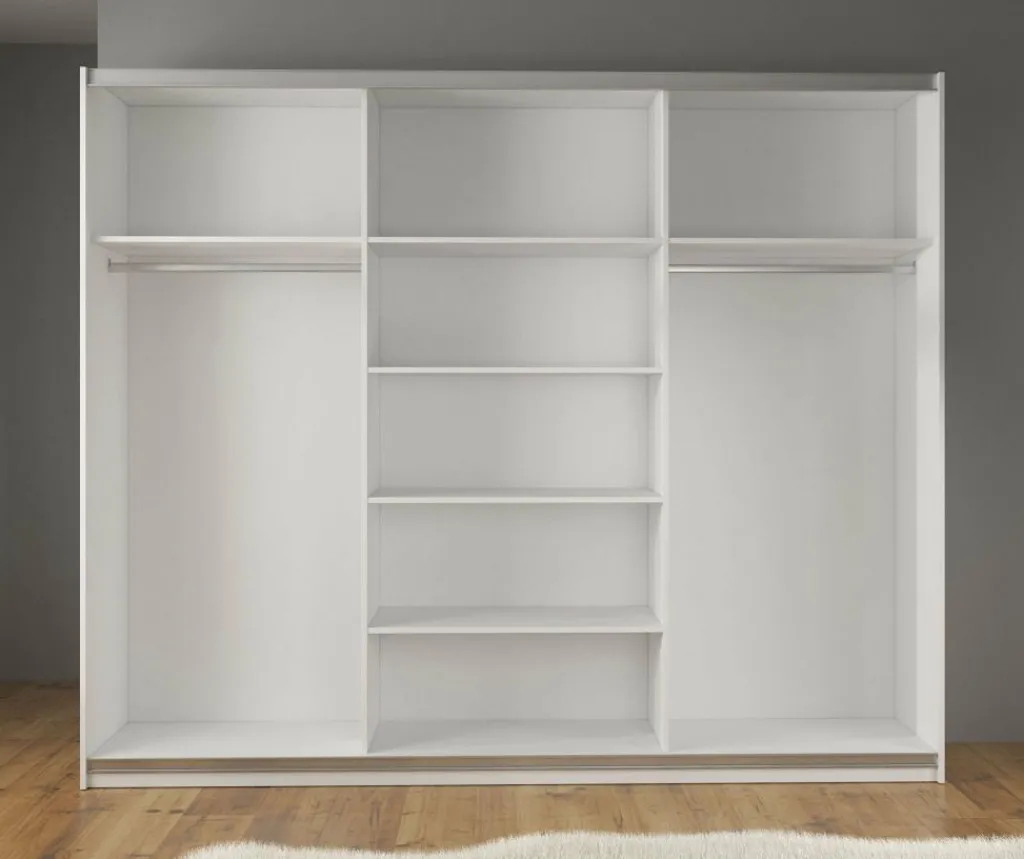 Kledingkast Mariah is een moderne garderobekast uitgevoerd in mat wit met hoogglans witte schuifdeur. De kledingkast heeft drie schuifdeuren met daarachter veel opbergruimte. Op de middelste schuifdeur zit een spiegel. Aan de linker- en rechterkant van de kast vind je twee stangen om kleding op te hangen. Daarnaast beschikt de kast over in totaal 7 vakken om kleding op te bergen.
