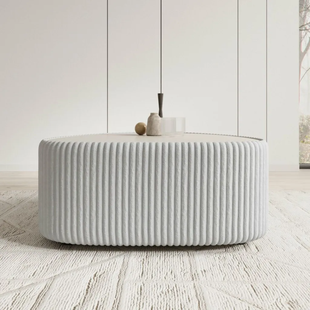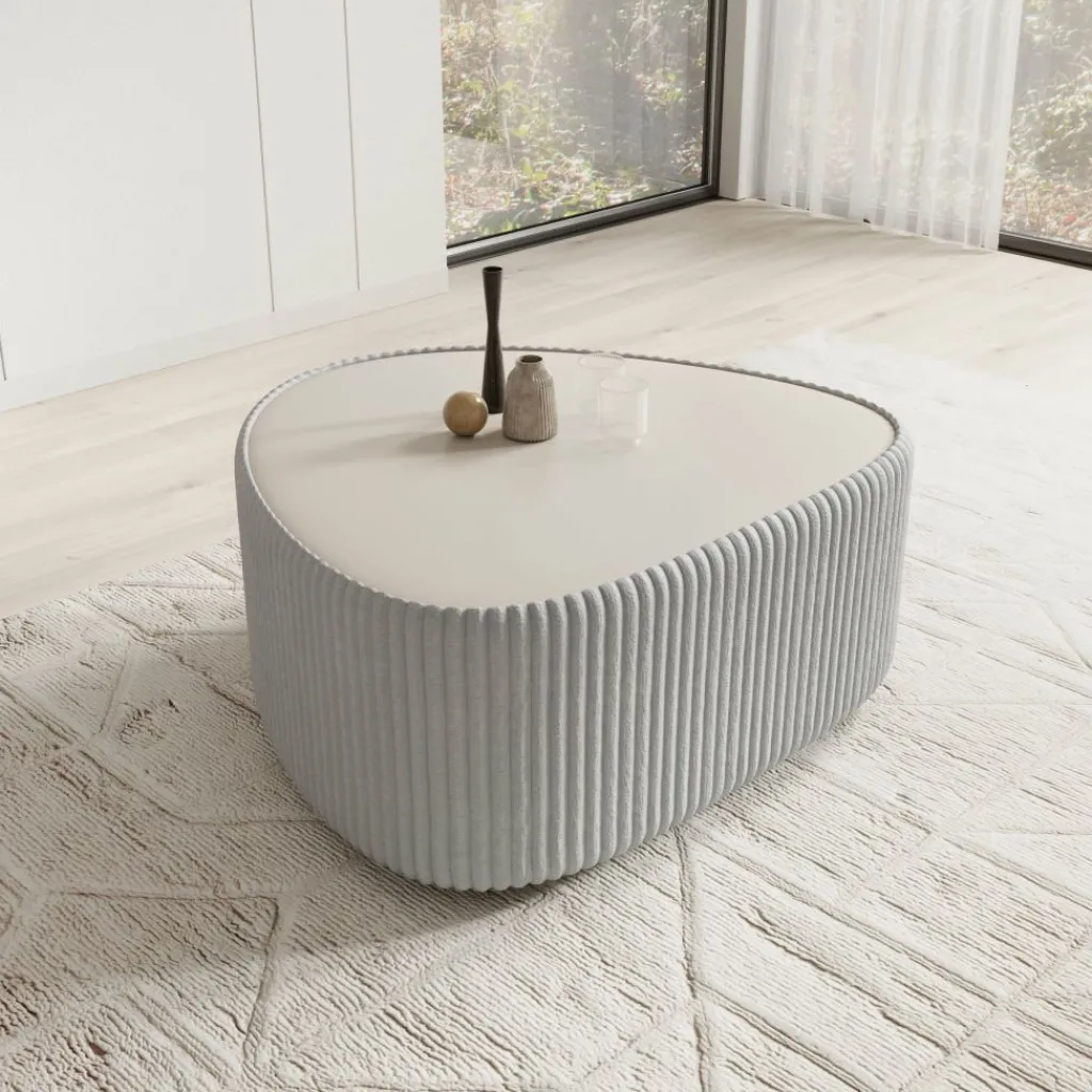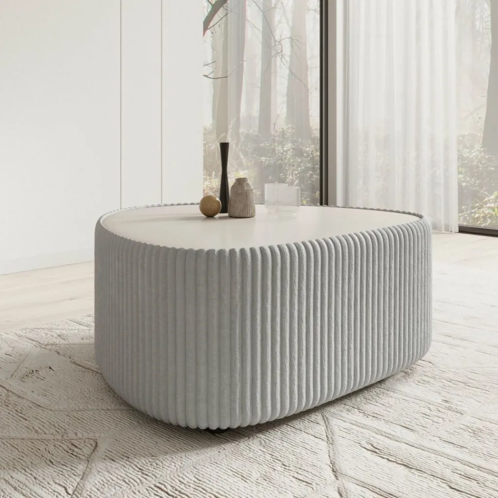 De tafel is rondom bekleed met een fluffy ribstof in grijze tint die het meubel een duidelijke structuur geeft. Het verticale ribpatroon loopt volledig rondom door en vormt samen met het glad afgewerkte bovenblad een herkenbaar contrast. Dankzij de afgeronde hoeken blijft de tafel praktisch in gebruik binnen de loopruimte.