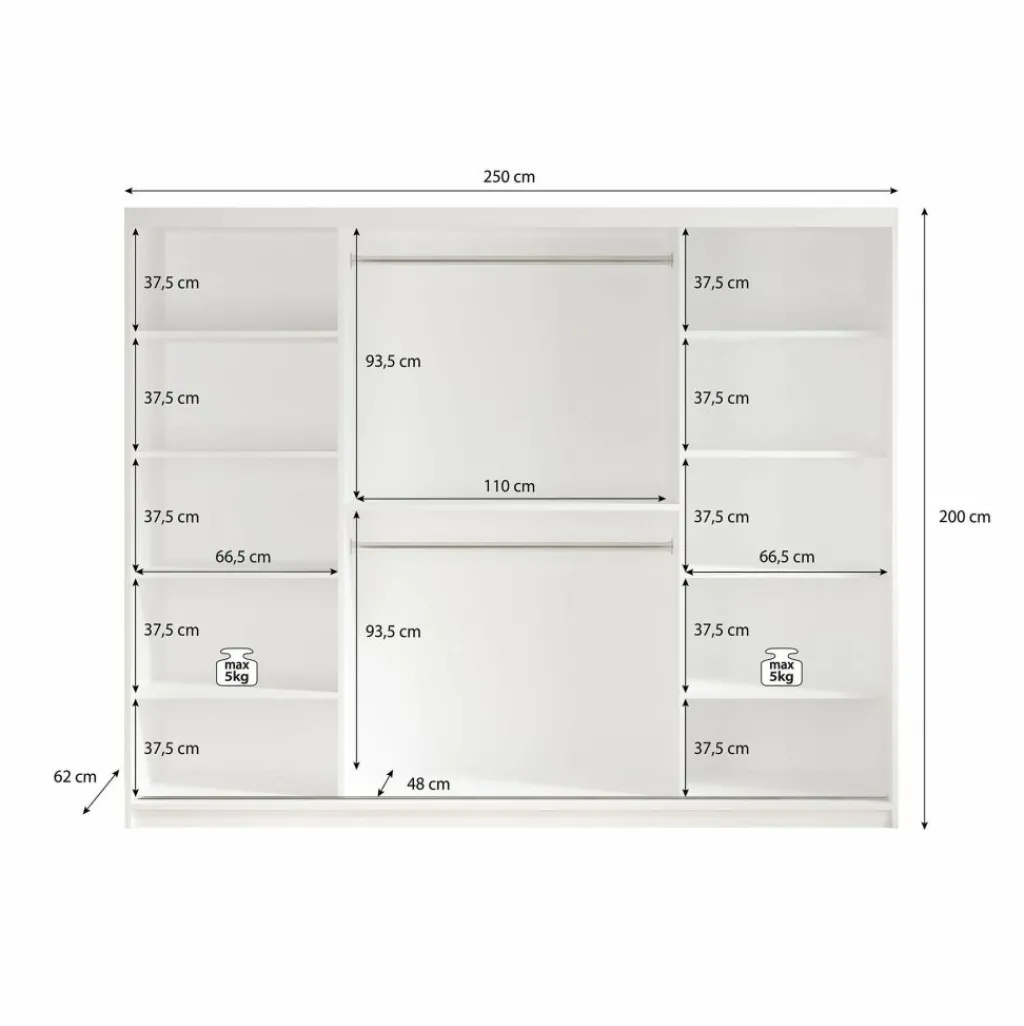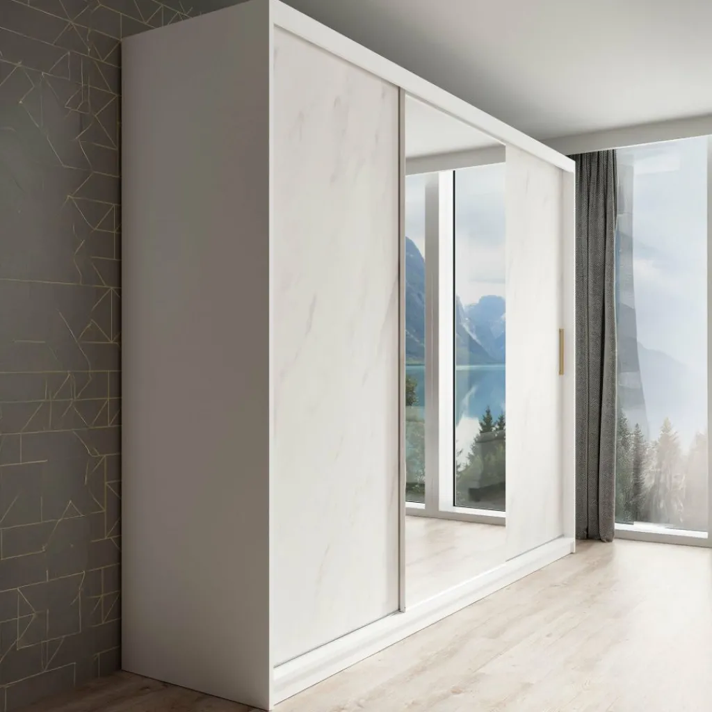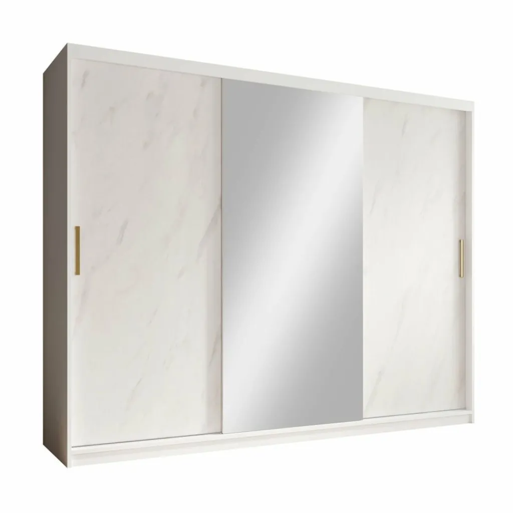 Kledingkast Marmer is een moderne garderobekast uitgevoerd in witte marmerlook kleur. De kledingkast heeft drie schuifdeuren met daarachter veel opbergruimte. De deuren zijn te openen middels goudkleurige handgrepen. Op de middelste deur zit een grote spiegel. In de binnenkant van de kast vind je 10 opbergvakken. Daarnaast beschikt de kast over twee stangen om kleding op te hangen.