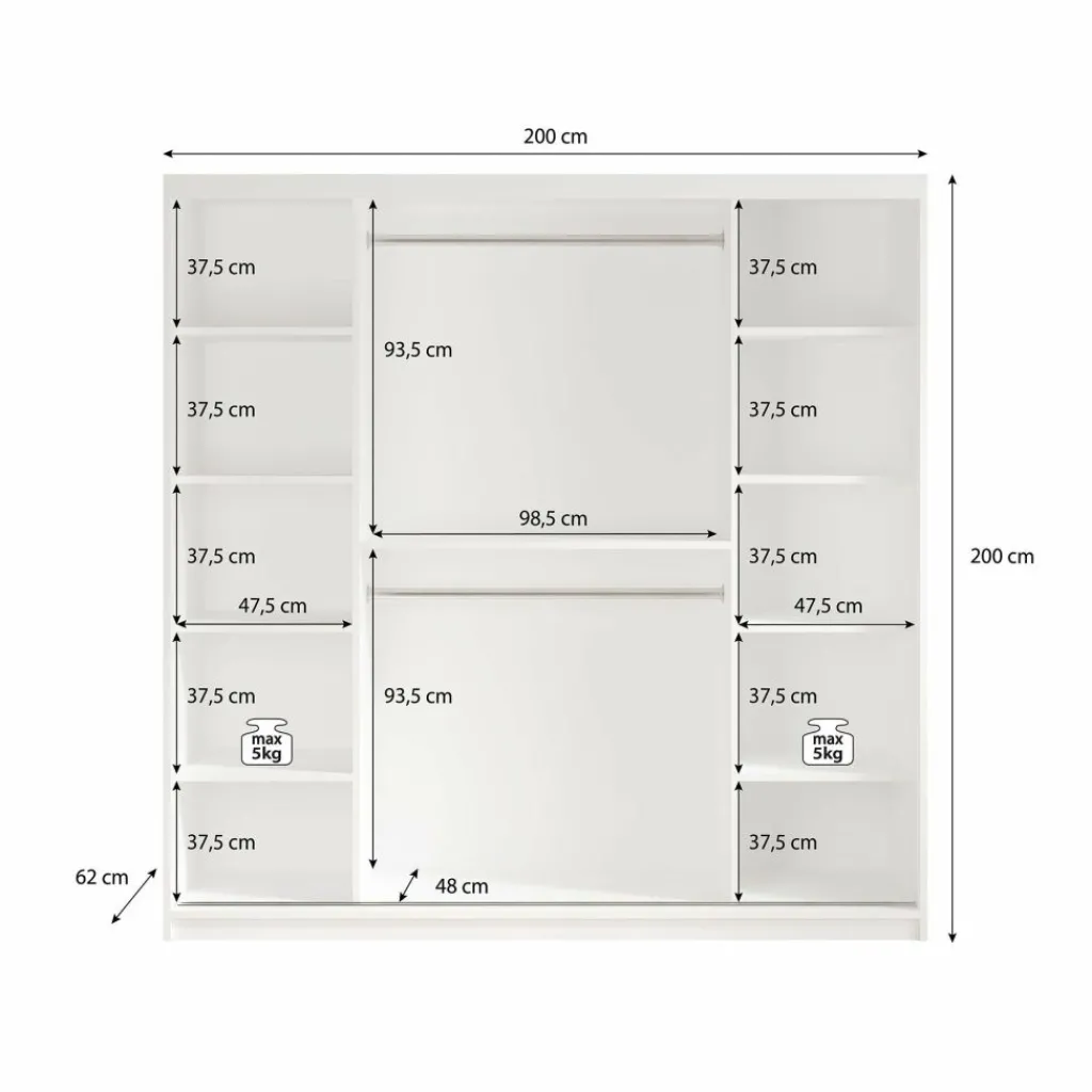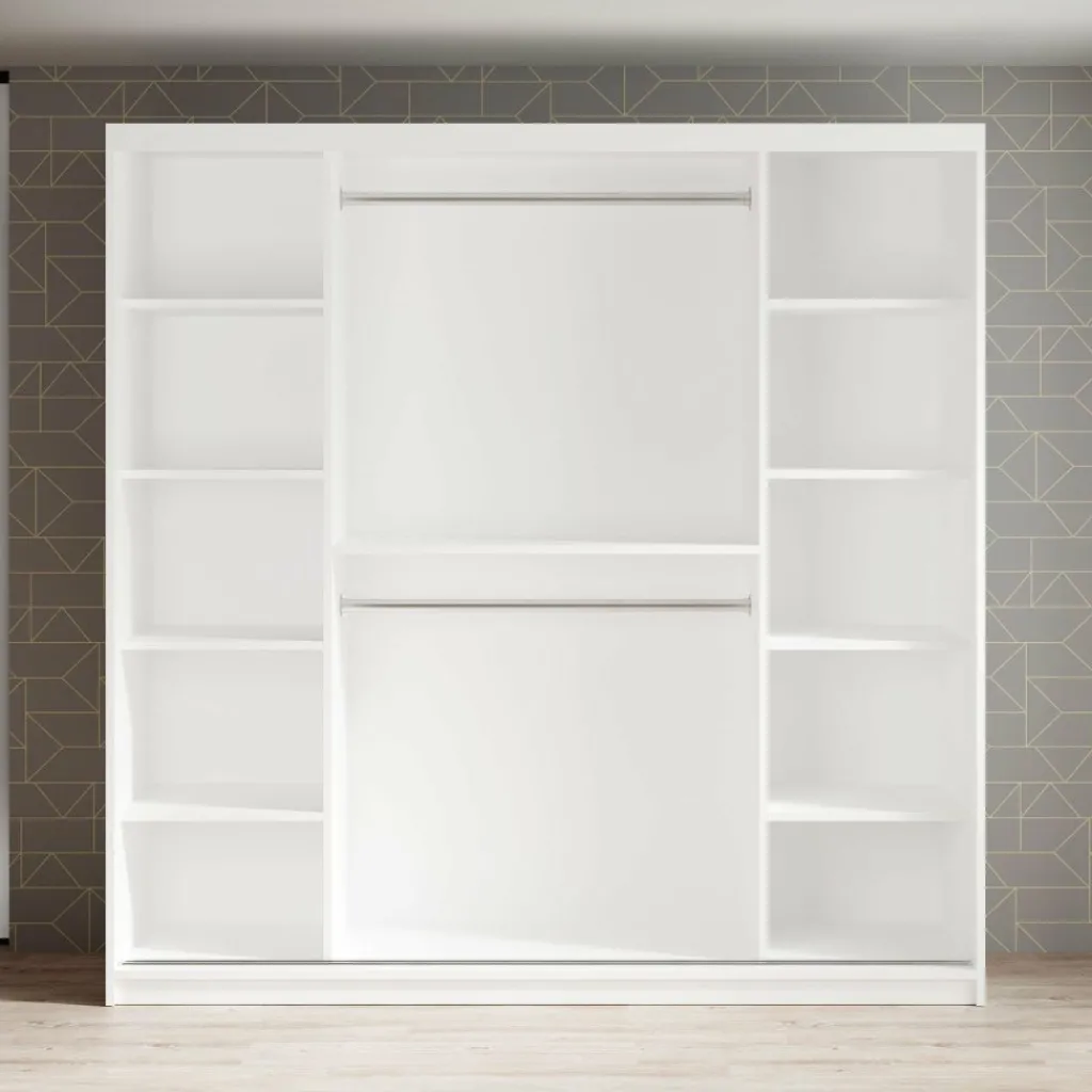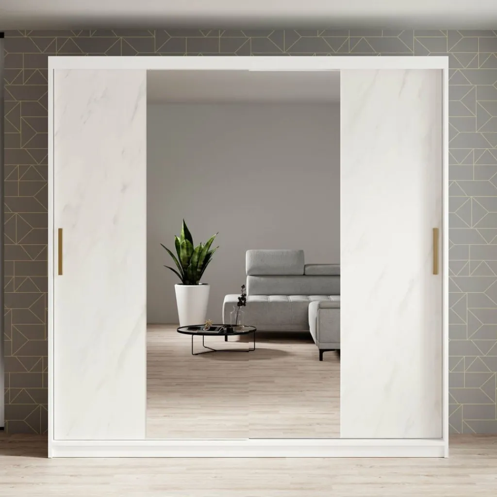Kledingkast Marmer is een moderne garderobekast uitgevoerd in witte marmerlook kleur. De kledingkast heeft twee schuifdeuren met daarachter veel opbergruimte. De deuren zijn te openen middels goudkleurige handgrepen. Op beide deuren zitten grote spiegels. In de binnenkant van de kast vind je 10 opbergvakken. Daarnaast beschikt de kast over twee stangen om kleding op te hangen.