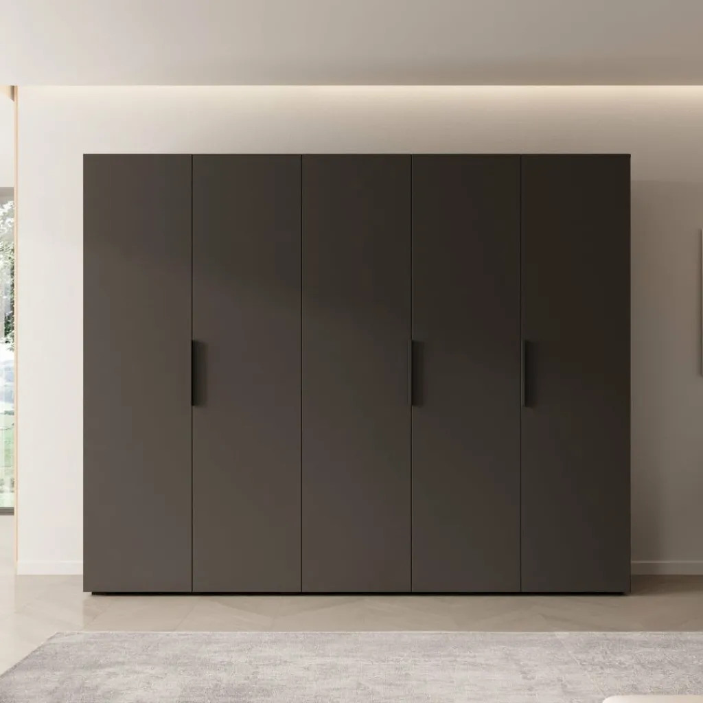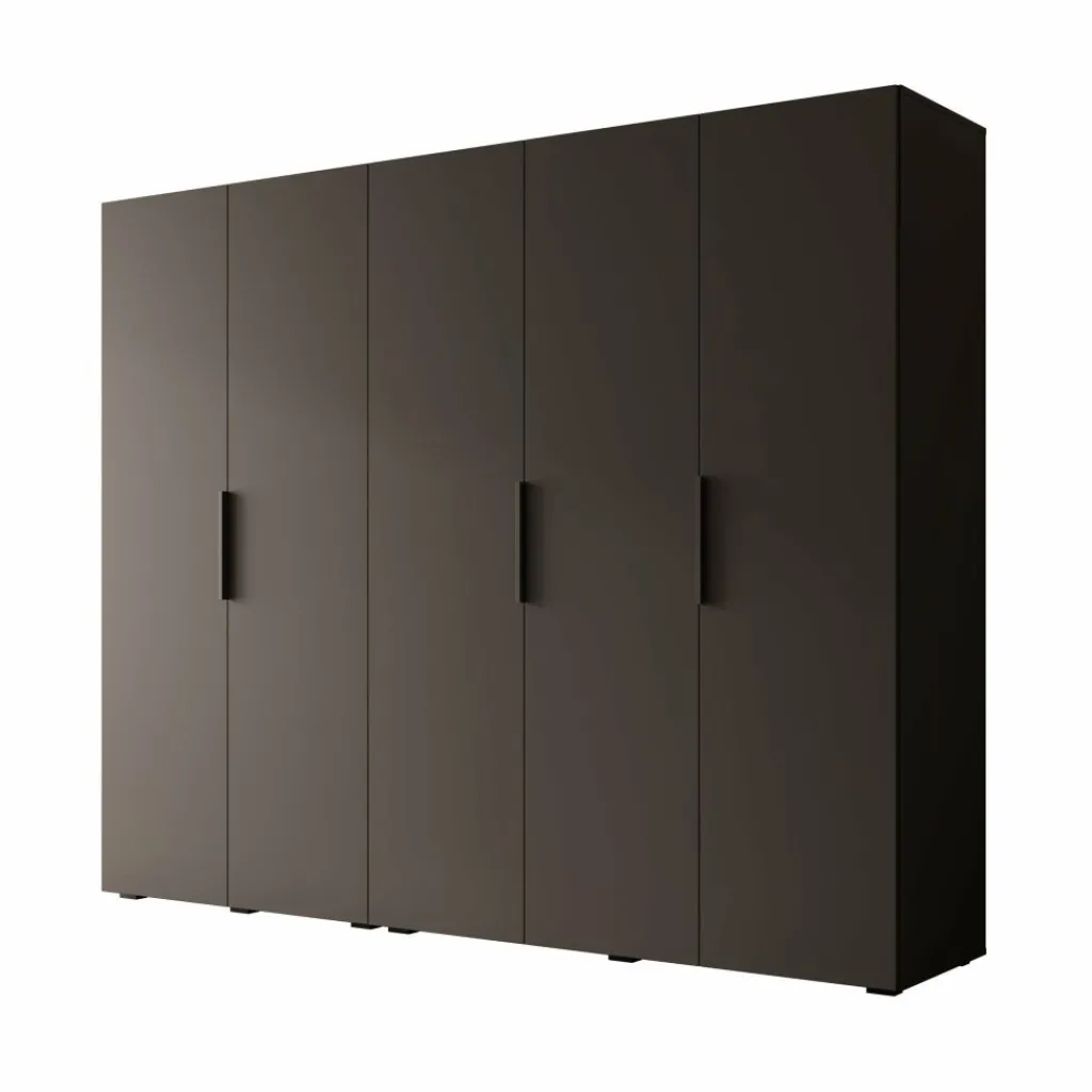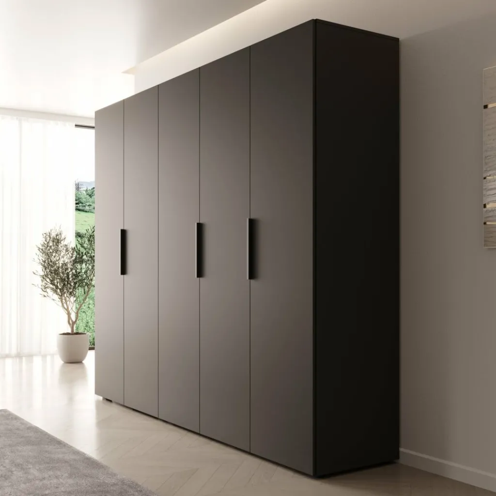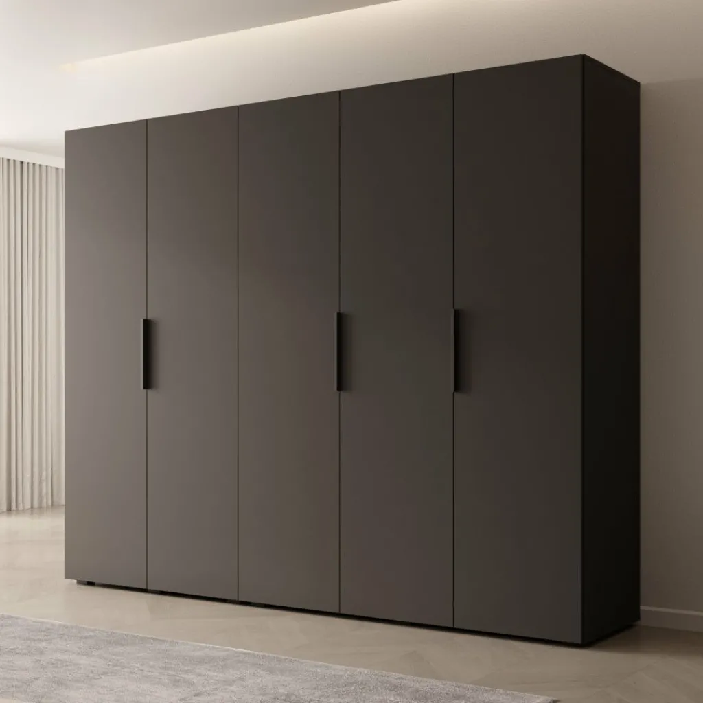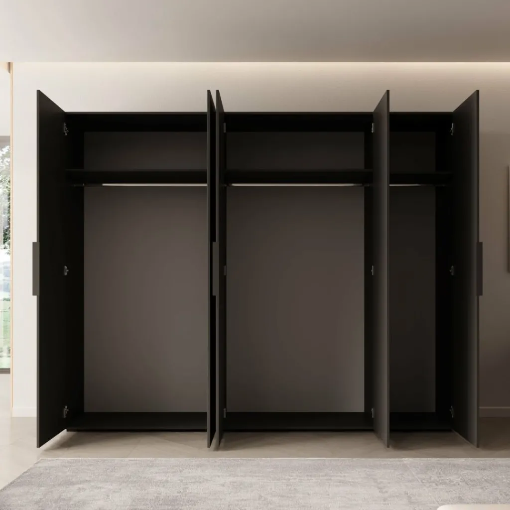 De kledingkast Marquesa is een ruime opbergoplossing van 250 cm breed, uitgevoerd in een frisse witte kleur. De kast heeft vijf draaideuren met lange, zwarte handgrepen en een moderne, strakke vormgeving.