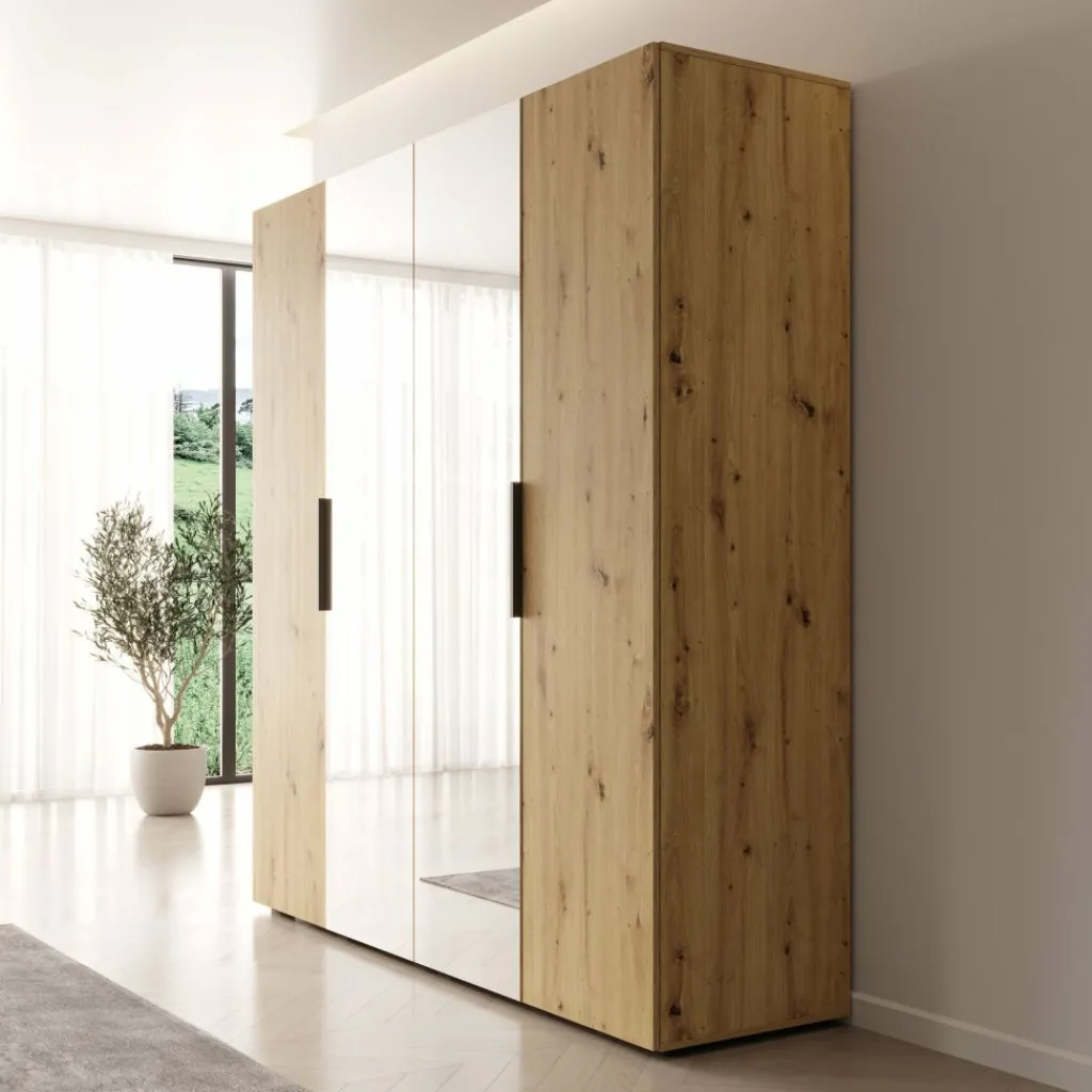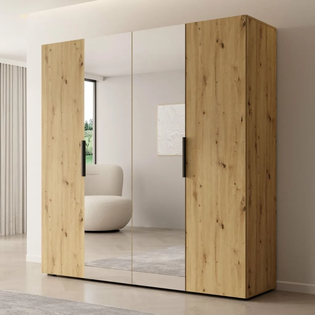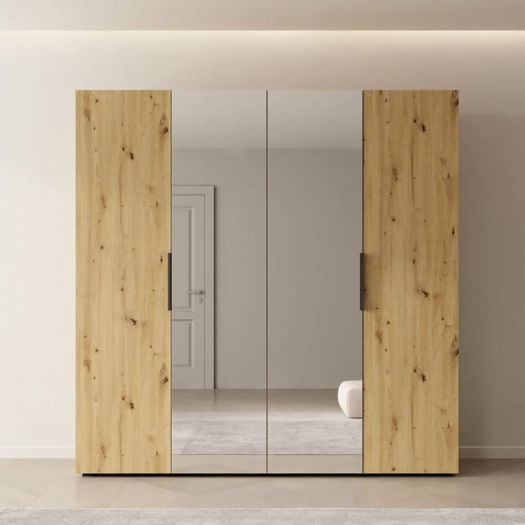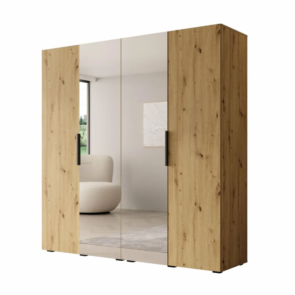 De Marquesa kledingkast van Meubella is uitgevoerd met een eiken patroon en heeft een afmeting van 200 x 50 x 202 centimeter. De kast beschikt over meerdere draaideuren, waarvan twee deuren zijn voorzien van een spiegel. De handgrepen hebben een rechte vorm en zijn uitgevoerd in een donkere afwerking.