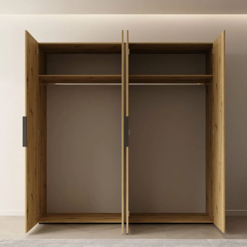 Aan de binnenzijde is opbergruimte aanwezig in de vorm van legplanken en een hanggedeelte. De kast heeft een rustige en neutrale uitstraling en kan worden gecombineerd met uiteenlopende slaapkamerstijlen.