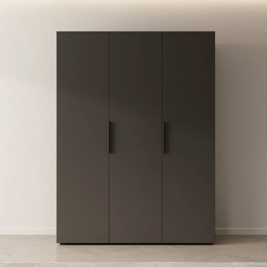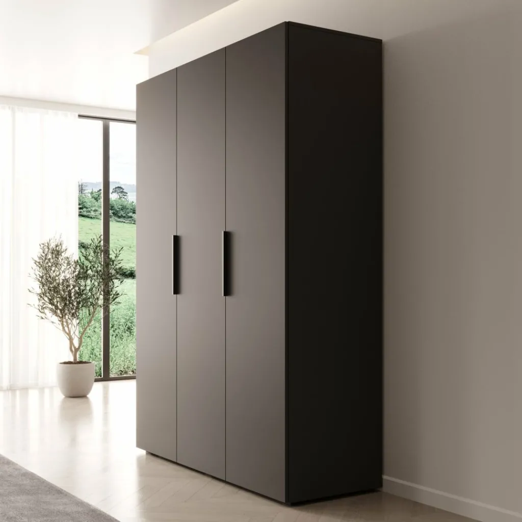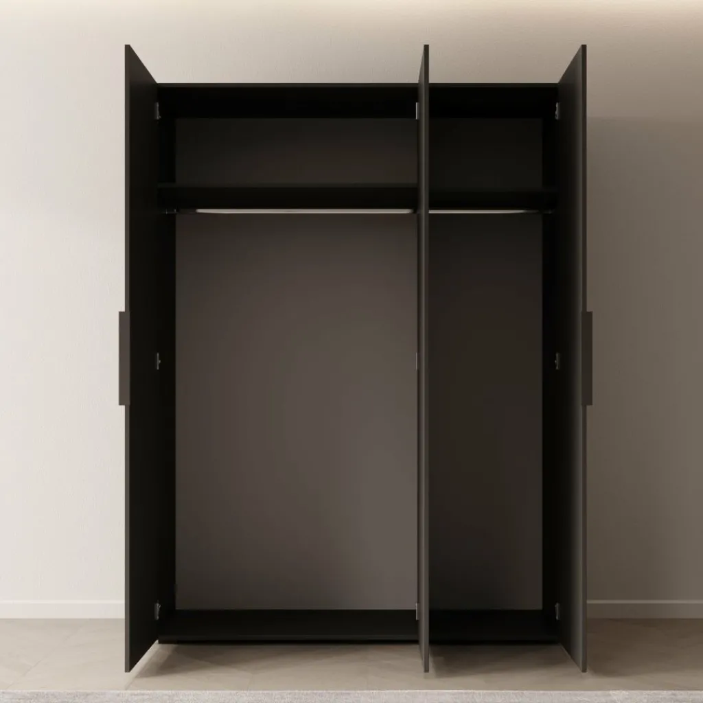 De kledingkast Marquesa combineert een diepzwarte look met een strak, modern ontwerp. Met drie draaideuren en geïntegreerde zwarte handgrepen past deze kast moeiteloos in verschillende interieurs.