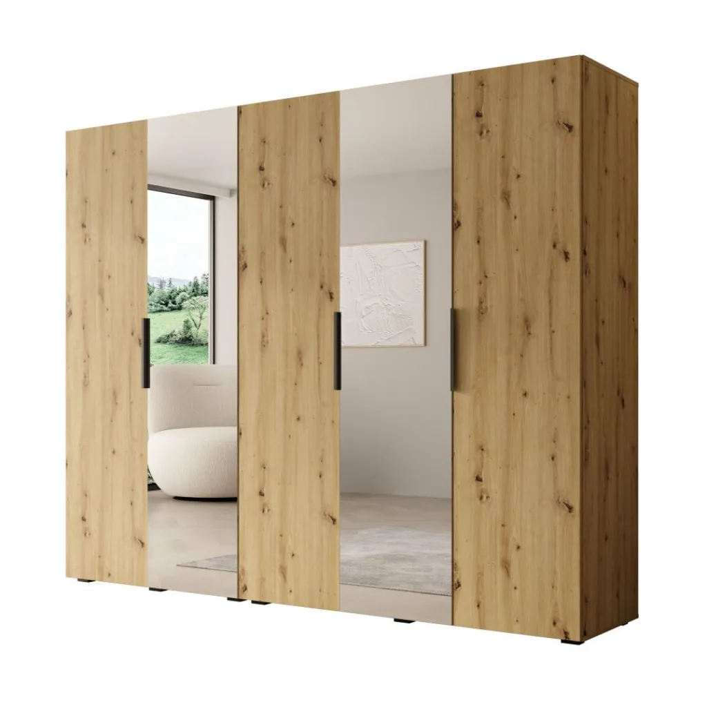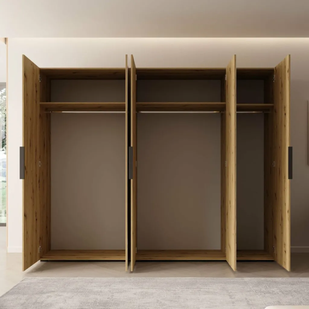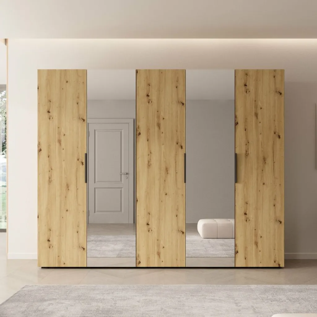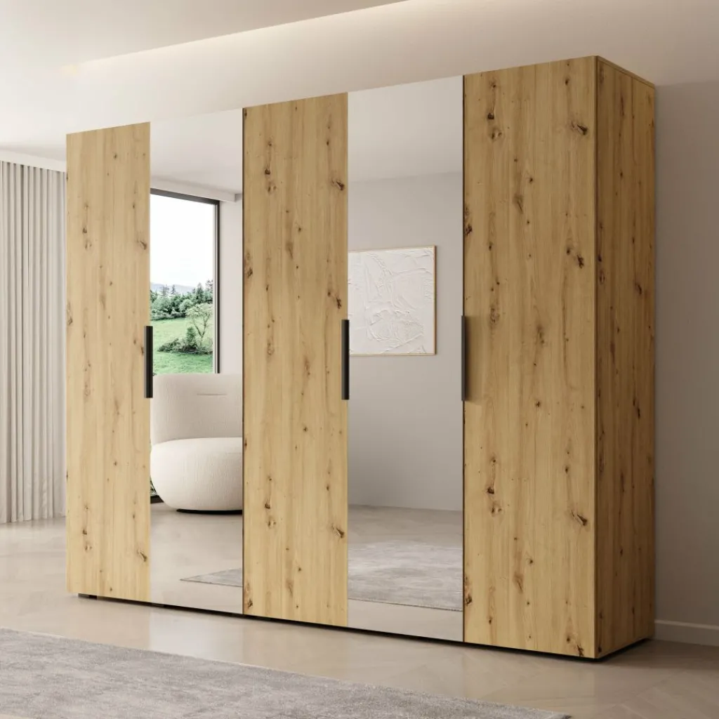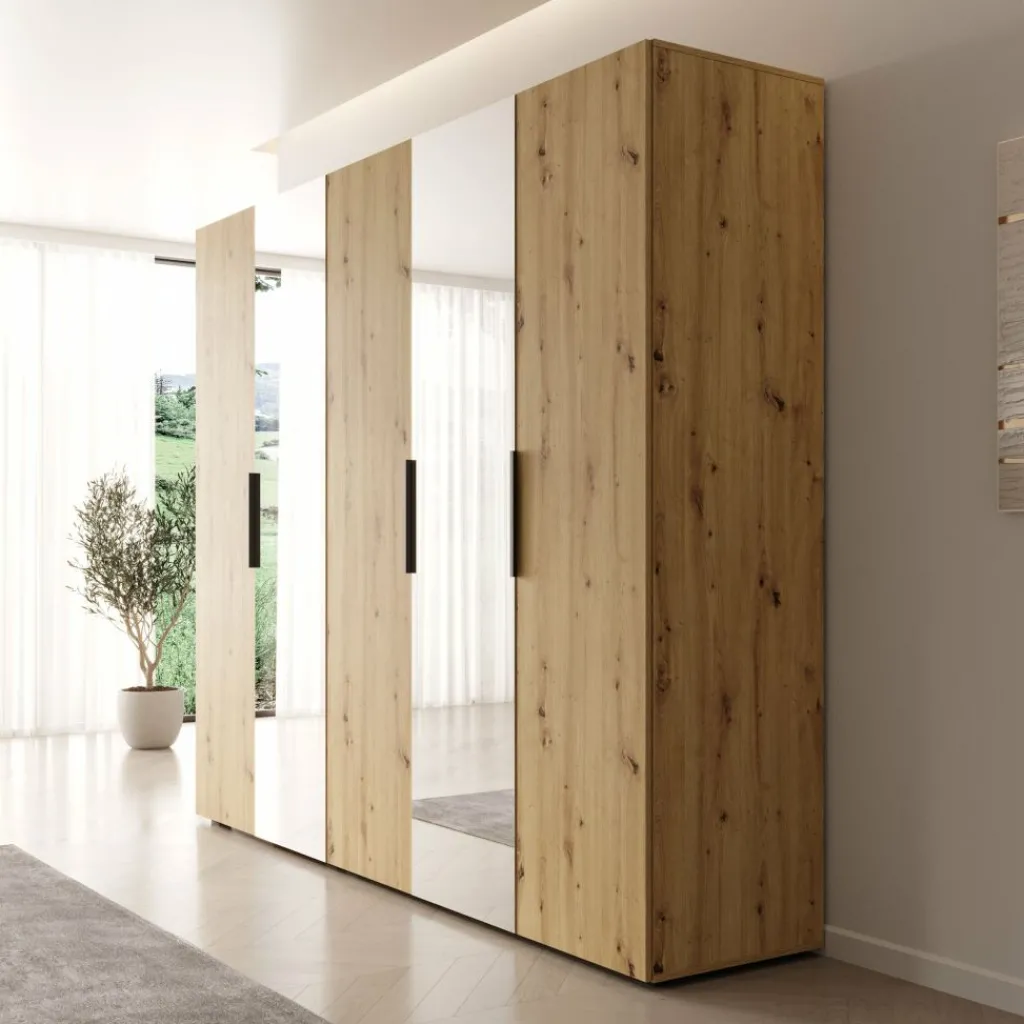 De Marquesa kledingkast in eiken heeft een rustige en warme uitstraling, waarbij het natuurlijke houtpatroon mooi naar voren komt. De twee middelste deuren zijn voorzien van grote spiegels, wat de ruimte optisch vergroot en zorgt voor extra lichtreflectie in de slaapkamer. De zwarte handgrepen vormen een strak contrast en geven het ontwerp een moderne afwerking.