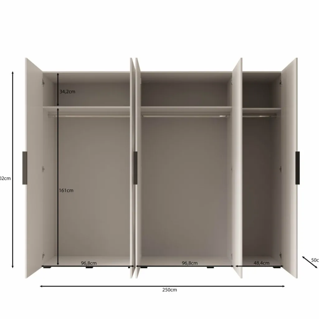 Achter de deuren vind je drie aparte vakken met elk een kledingroede en een brede bovenplank. Dit maakt het eenvoudig om kleding overzichtelijk te sorteren, of je nu veel hangkleding hebt of juist meer opbergruimte voor vouwen nodig hebt. De kast heeft een rustige uitstraling en past goed in slaapkamers met natuurlijke tinten of moderne accenten.