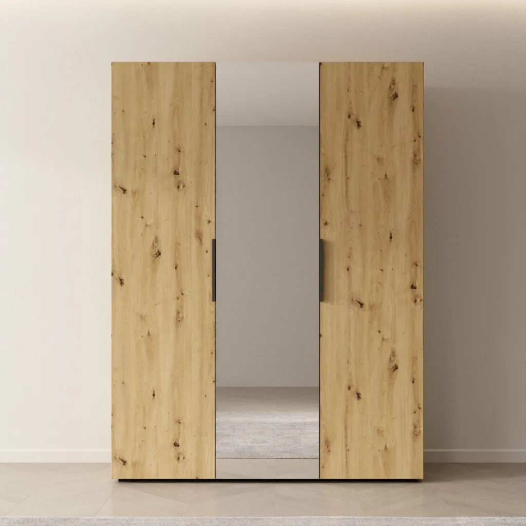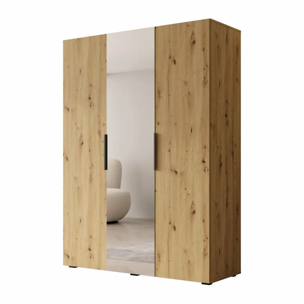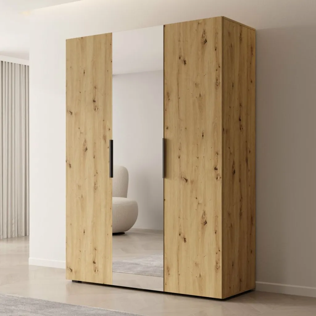 De Marquesa kledingkast van Meubella is uitgevoerd met een eiken patroon en heeft een afmeting van 150 x 50 x 202 centimeter. De kast beschikt over draaideuren, waarvan één deur is voorzien van een spiegel. De handgrepen zijn recht vormgegeven en hebben een donkere afwerking.