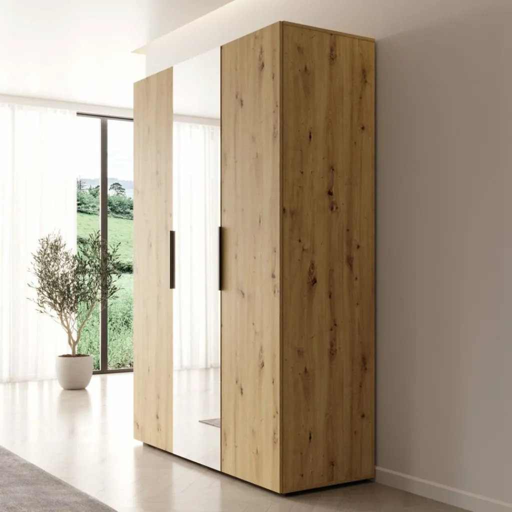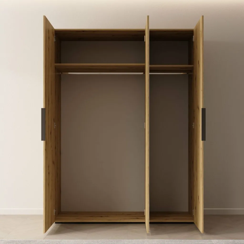 De binnenzijde bestaat uit een hanggedeelte en legplanken voor het opbergen van kleding en accessoires. De kast heeft een neutrale uitstraling en past bij verschillende slaapkamerstijlen.