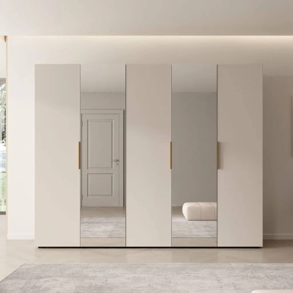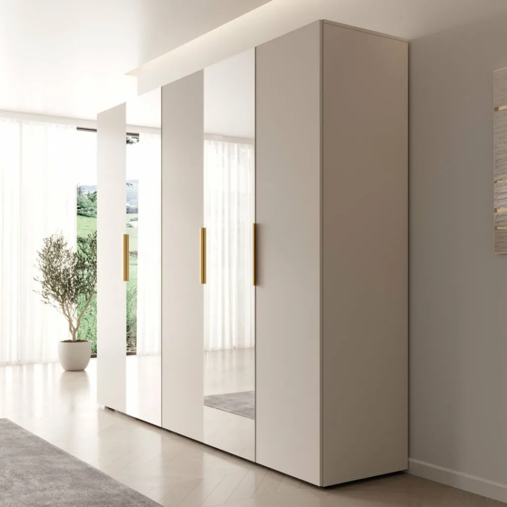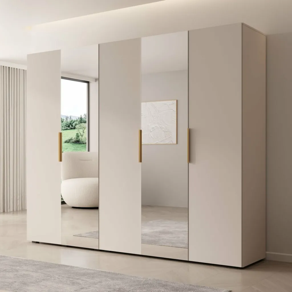 De Marquesa kledingkast in beige heeft een strakke en moderne uitstraling. De deuren zijn voorzien van twee grote spiegels, waardoor de ruimte optisch groter oogt en je eenvoudig outfits kunt bekijken. De rechte lijnen en de matte beige afwerking zorgen voor een rustige en nette uitstraling in de slaapkamer.