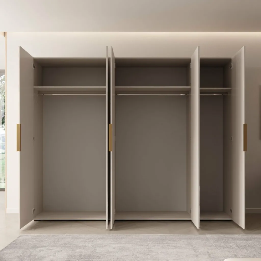 De kast is verdeeld in drie ruime compartimenten. Elk deel beschikt over een kledingroede en een brede legplank, waardoor zowel hangkleding als gevouwen items overzichtelijk kunnen worden opgeborgen. De gouden handgrepen vormen een subtiel accent, zonder nadruk te leggen op het ontwerp.