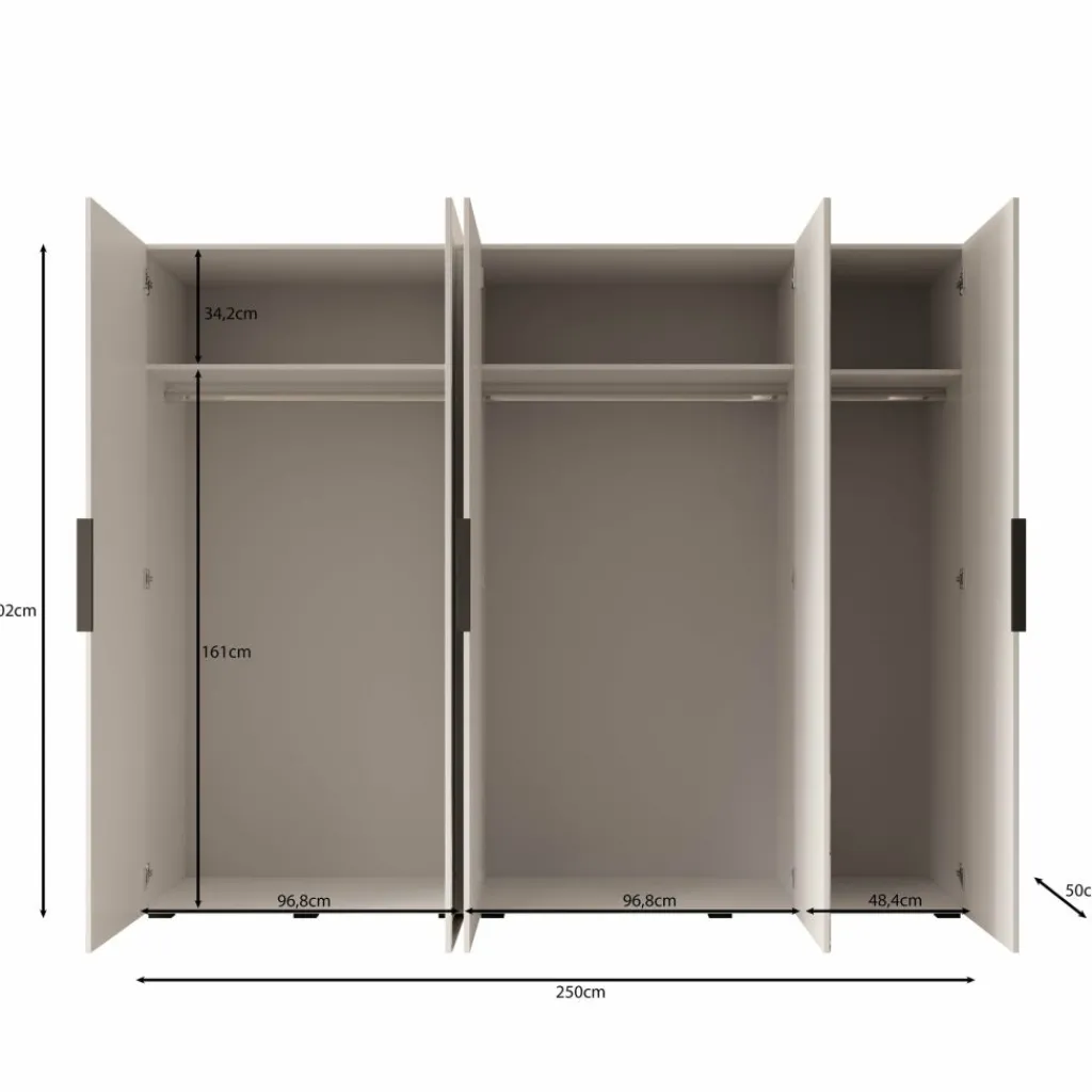 Ook deze variant is ingedeeld in drie vakken met elk een kledingroede en een legplank, waardoor de kast veel opbergruimte biedt en overzichtelijk blijft. Door de rustige lijnen en gelijkmatige indeling past de kast goed in zowel moderne, luxe als minimalistische interieurs.
