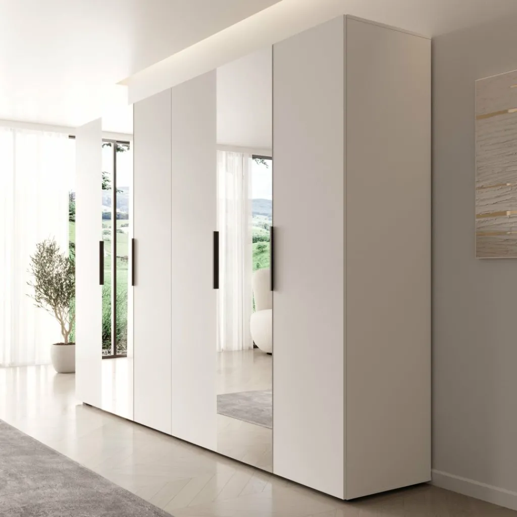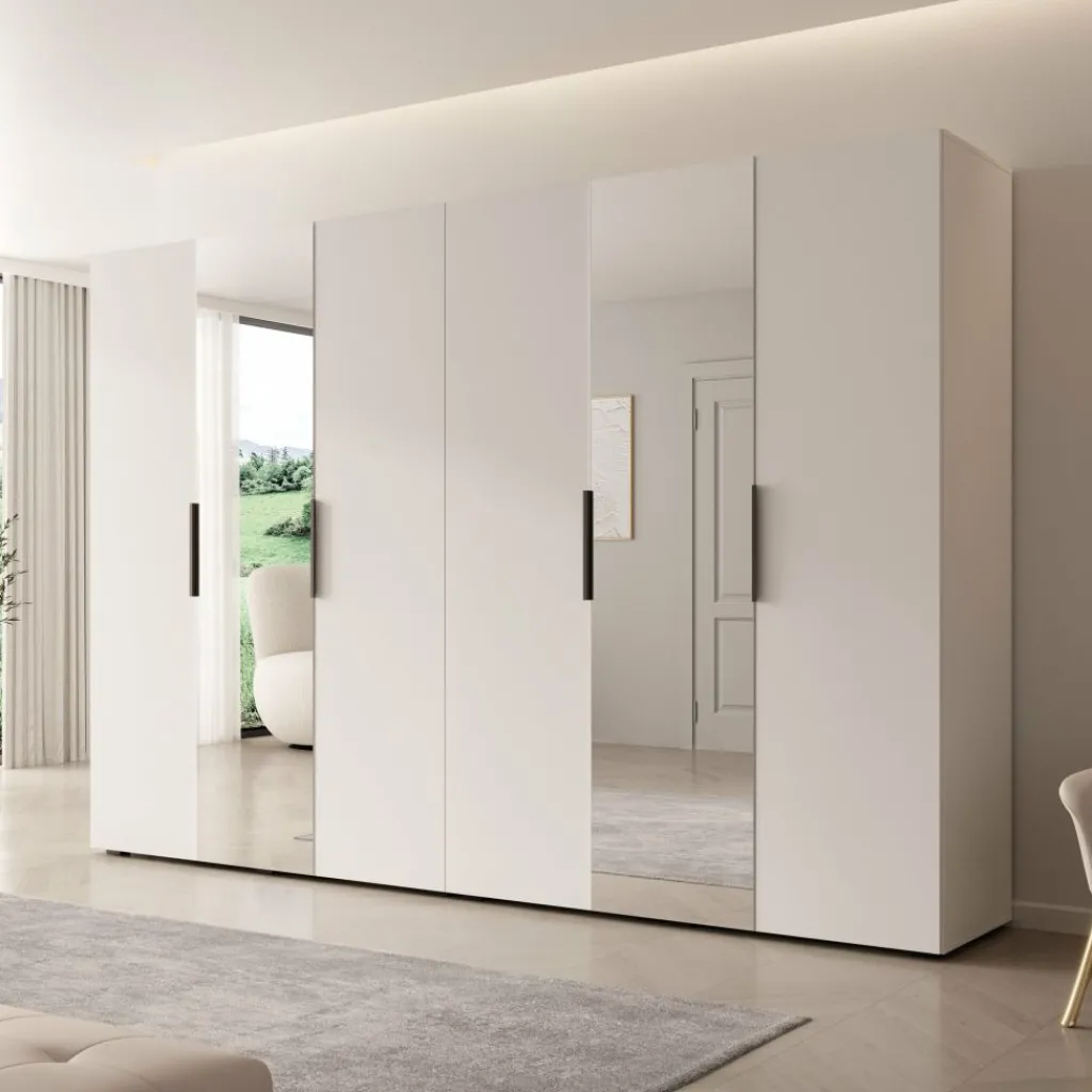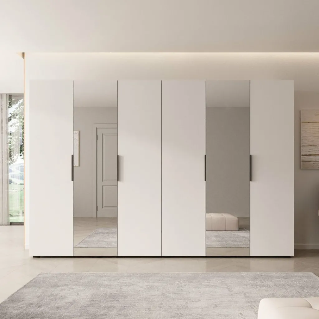 De Marquesa kledingkast van Meubella is uitgevoerd in wit en heeft een afmeting van 300 x 50 x 202 centimeter. De kast is voorzien van meerdere draaideuren, waarbij twee deuren zijn uitgerust met een spiegel. De handgrepen hebben een rechte vormgeving en zijn uitgevoerd in een zwarte afwerking.