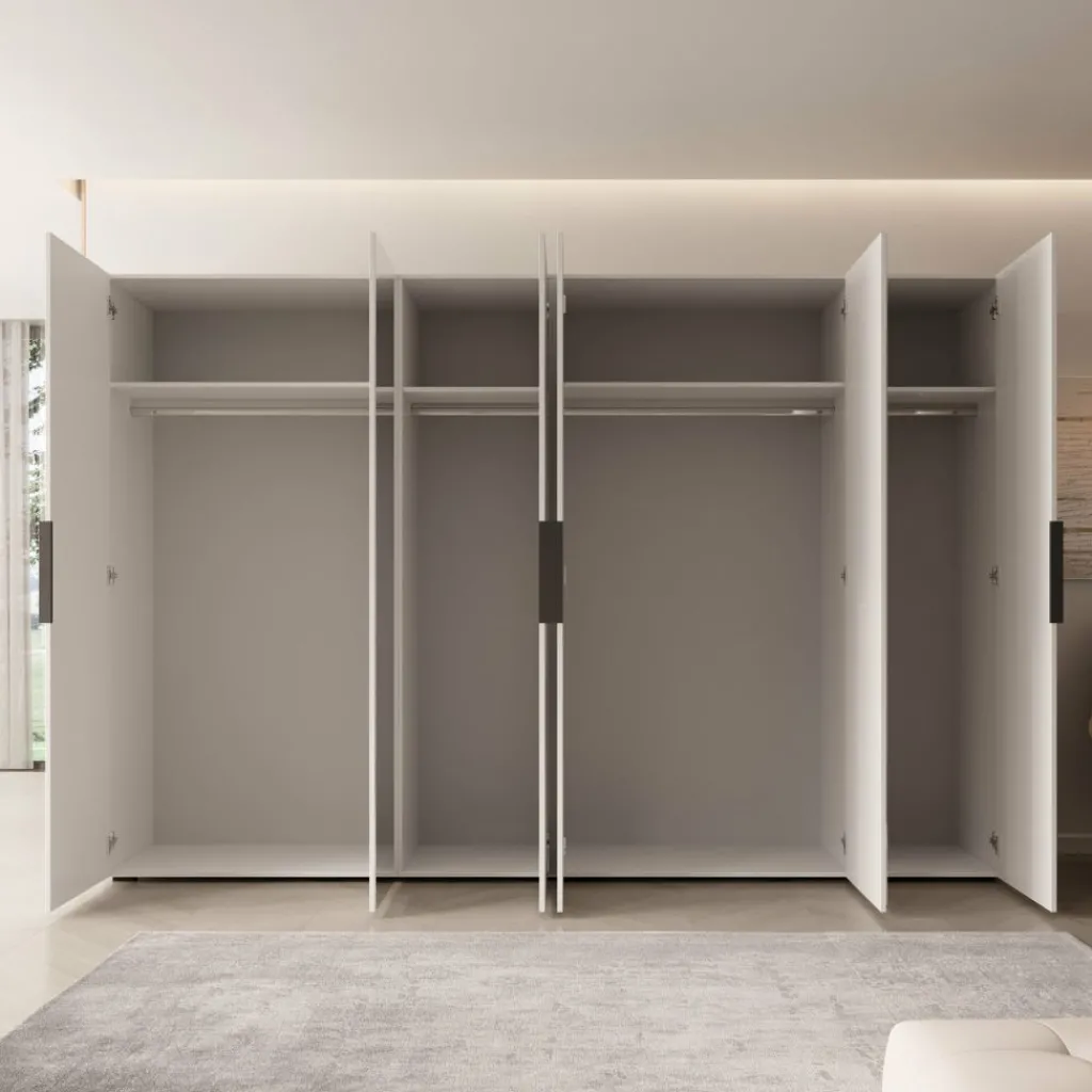 De binnenzijde bestaat uit een hanggedeelte en legplanken voor het opbergen van kleding en accessoires. Door de neutrale kleurstelling kan de kast worden toegepast in verschillende slaapkameropstellingen.