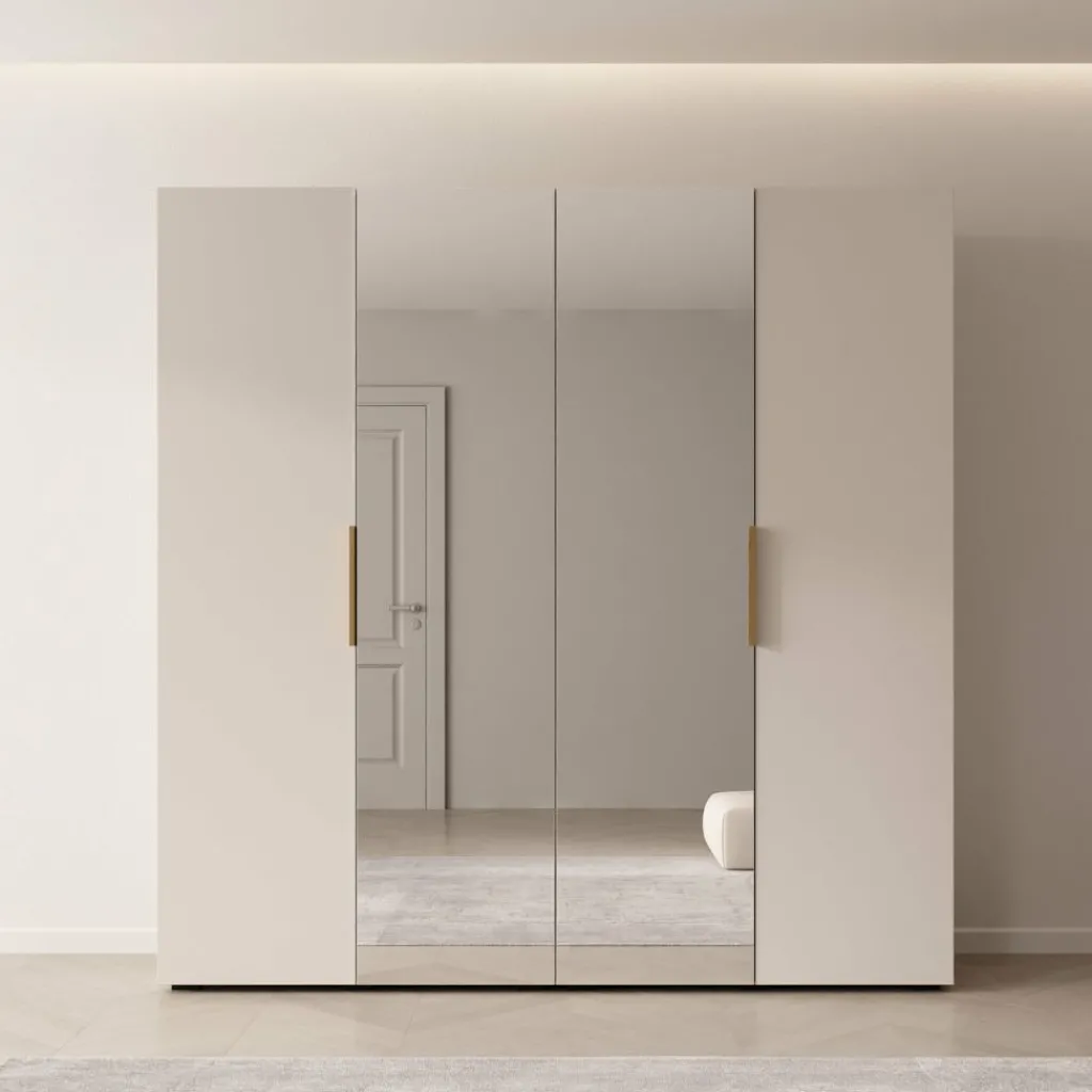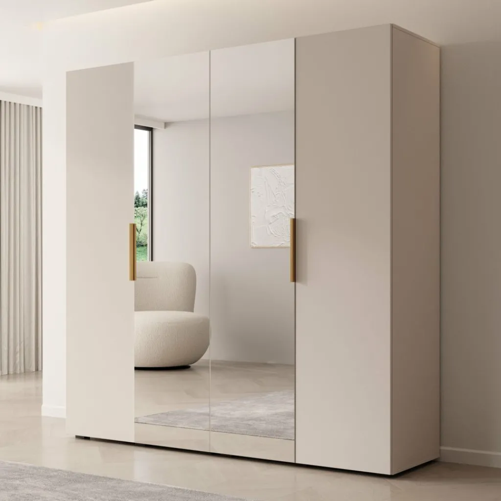 De Marquesa kledingkast van Meubella is uitgevoerd in beige en heeft een afmeting van 200 x 50 x 202 centimeter. De kast beschikt over meerdere draaideuren, waarvan twee deuren zijn voorzien van een spiegel. De handgrepen hebben een rechte vorm en zijn uitgevoerd in een goudkleurige afwerking.