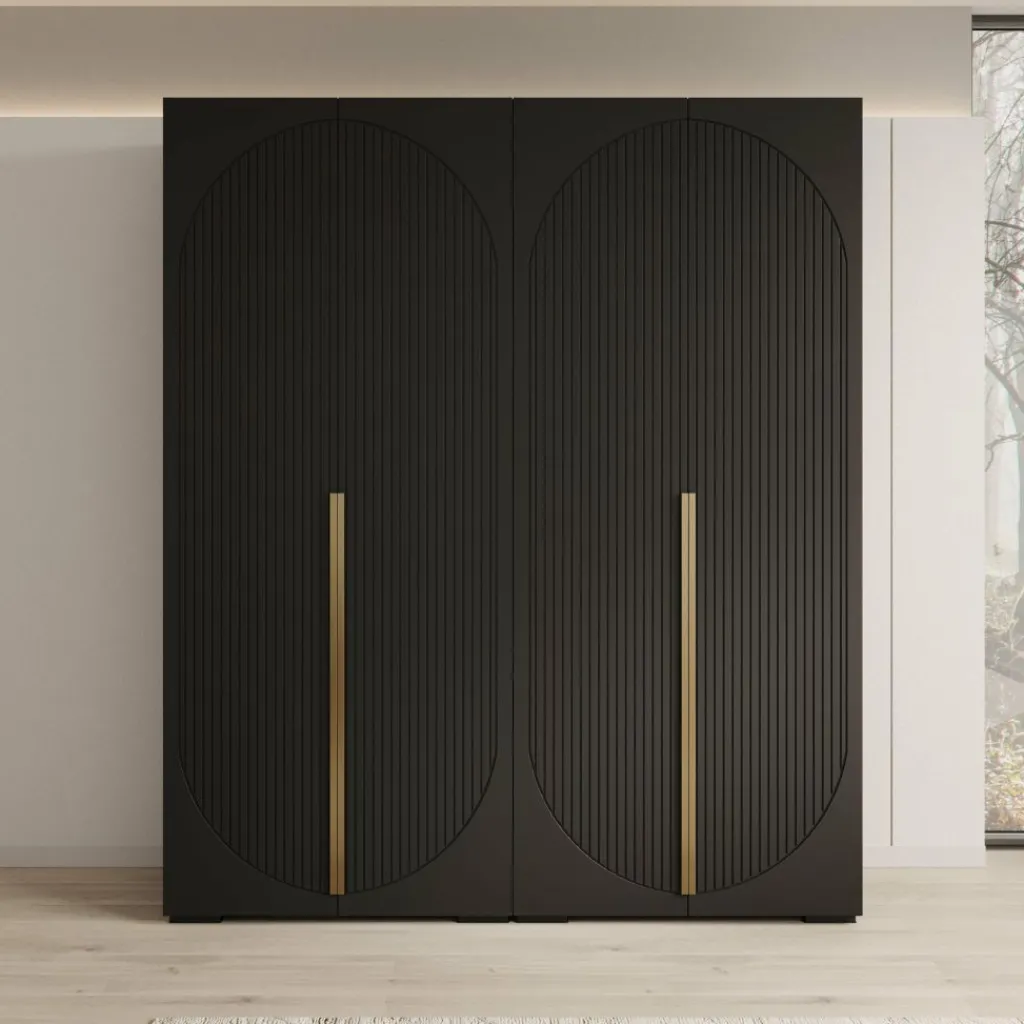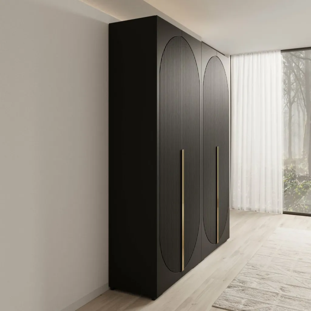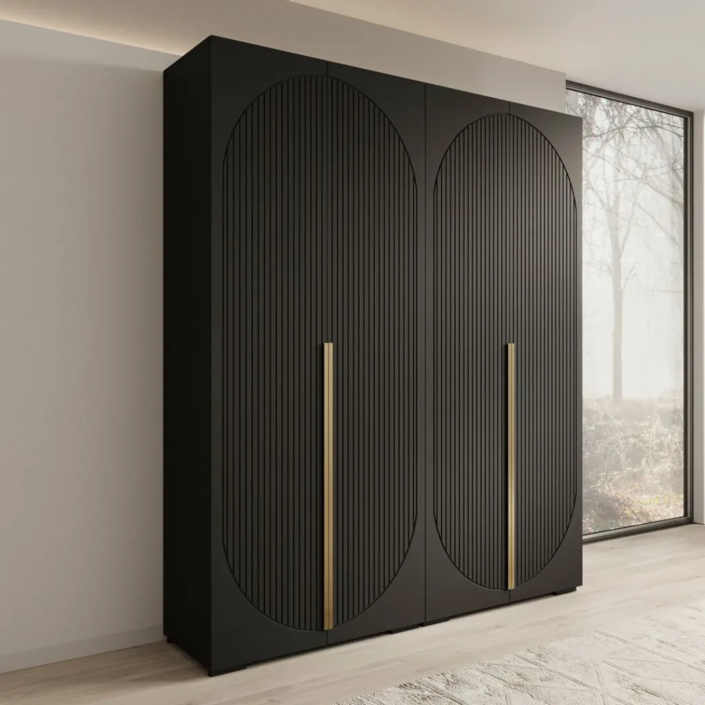 De zwarte afwerking en strakke belijning zorgen voor een modern en krachtig geheel. De verticale details in de deuren geven structuur aan het ontwerp, waardoor de Mayfair kledingkast goed past binnen moderne en minimalistische interieurs.