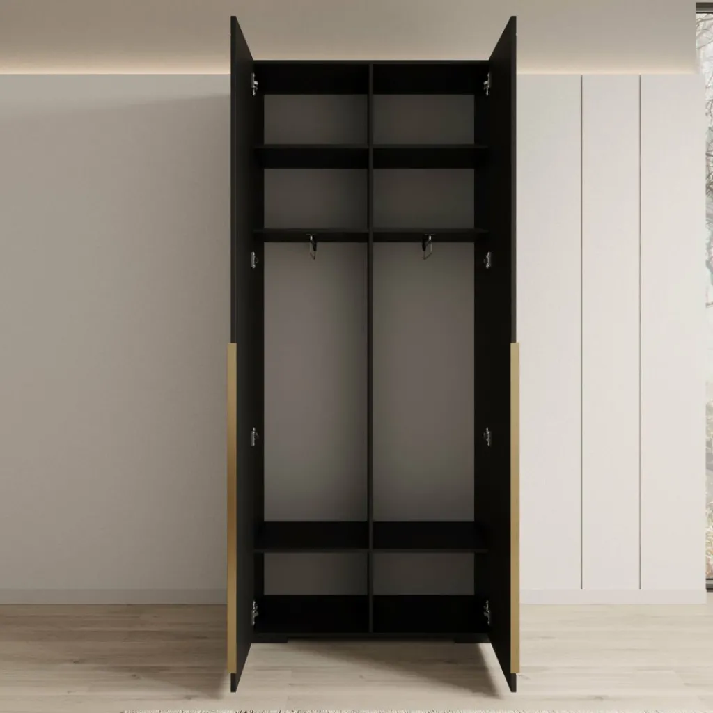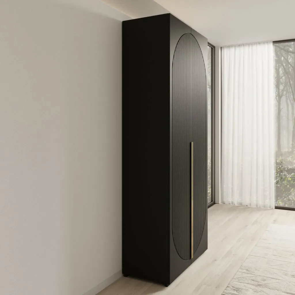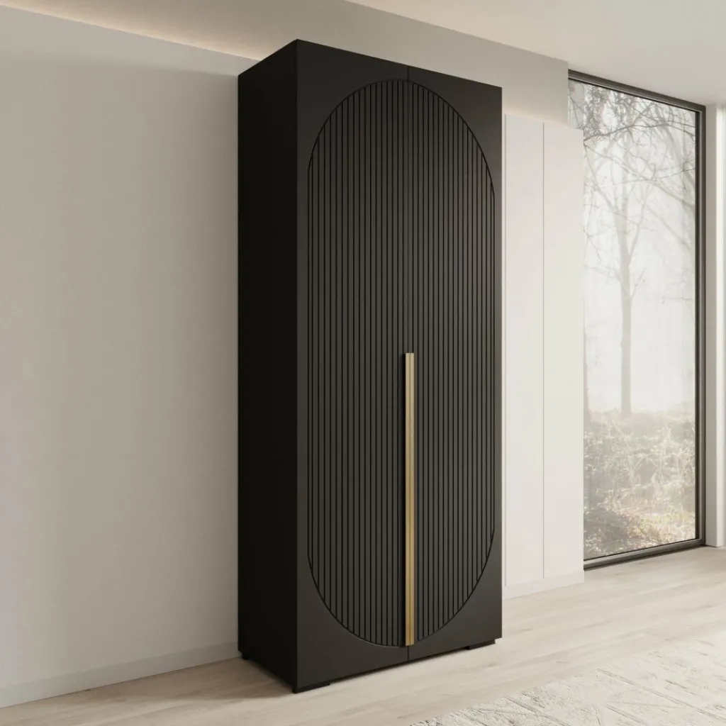 De zwarte afwerking, gecombineerd met de verticale belijning en het afgeronde detail in de deuren, geeft de kast een uitgesproken en modern karakter. De Mayfair kledingkast past goed in moderne en strakke interieurs waar vorm en functionaliteit samenkomen.