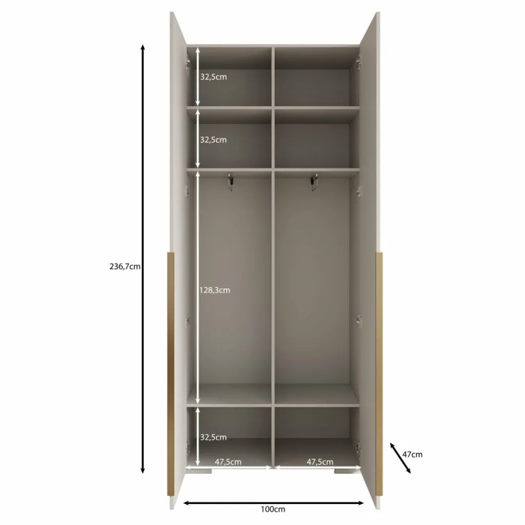 Achter de twee deuren is de kast overzichtelijk ingedeeld met legplanken en hanggedeeltes. Hierdoor kun je kleding ophangen en combineren met gevouwen items en accessoires, zonder dat de indeling onnodig complex wordt. De kast is praktisch in gebruik en geschikt voor dagelijks opbergen.