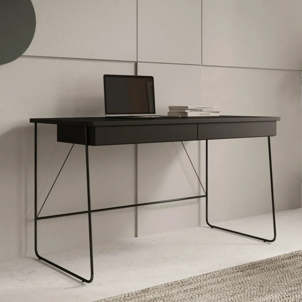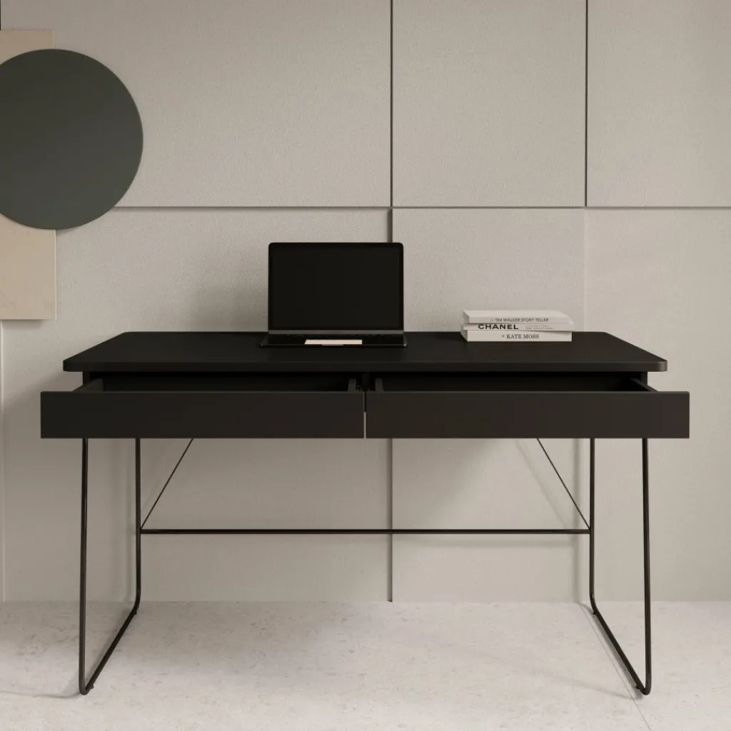 Het Medea bureau combineert een strak design met praktische functionaliteit, waardoor het perfect past in zowel een thuiskantoor als een stijlvolle werkhoek in de woonkamer. Met zijn zwarte blad, minimalistische lijnen en slanke metalen poten straalt dit bureau moderne elegantie uit, zonder in te leveren op gebruiksgemak.