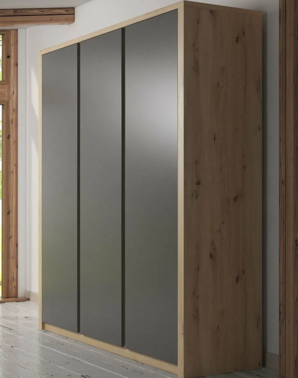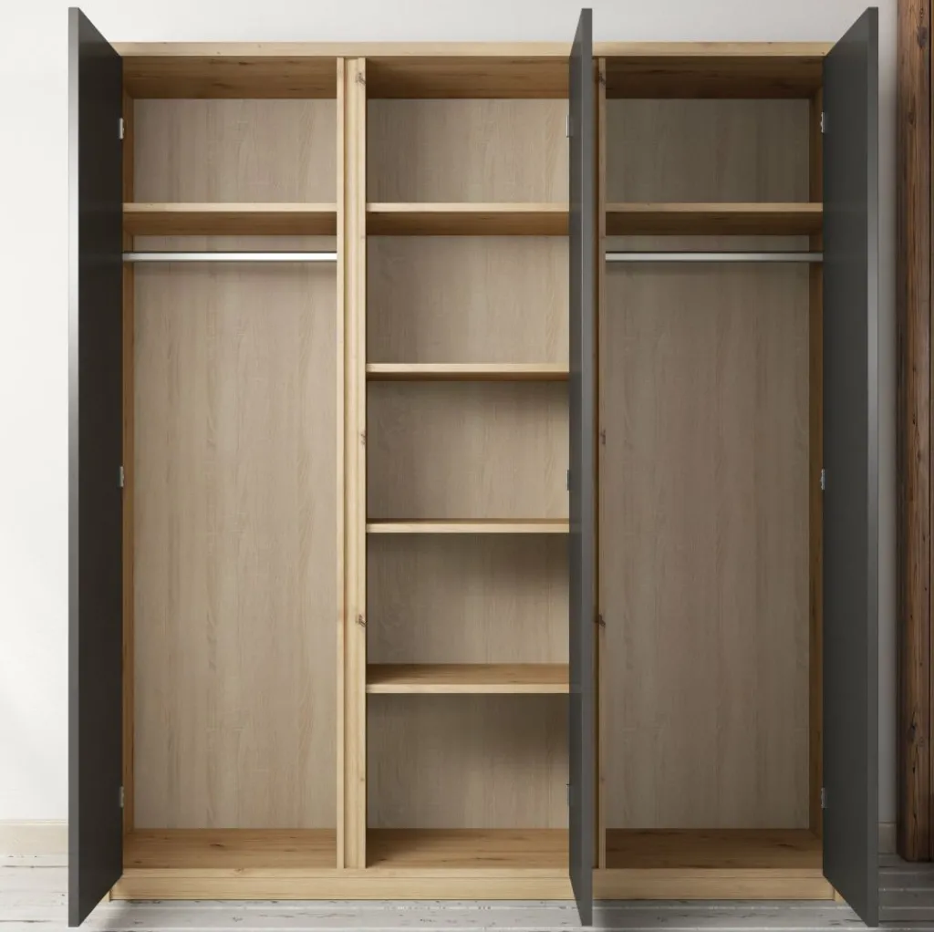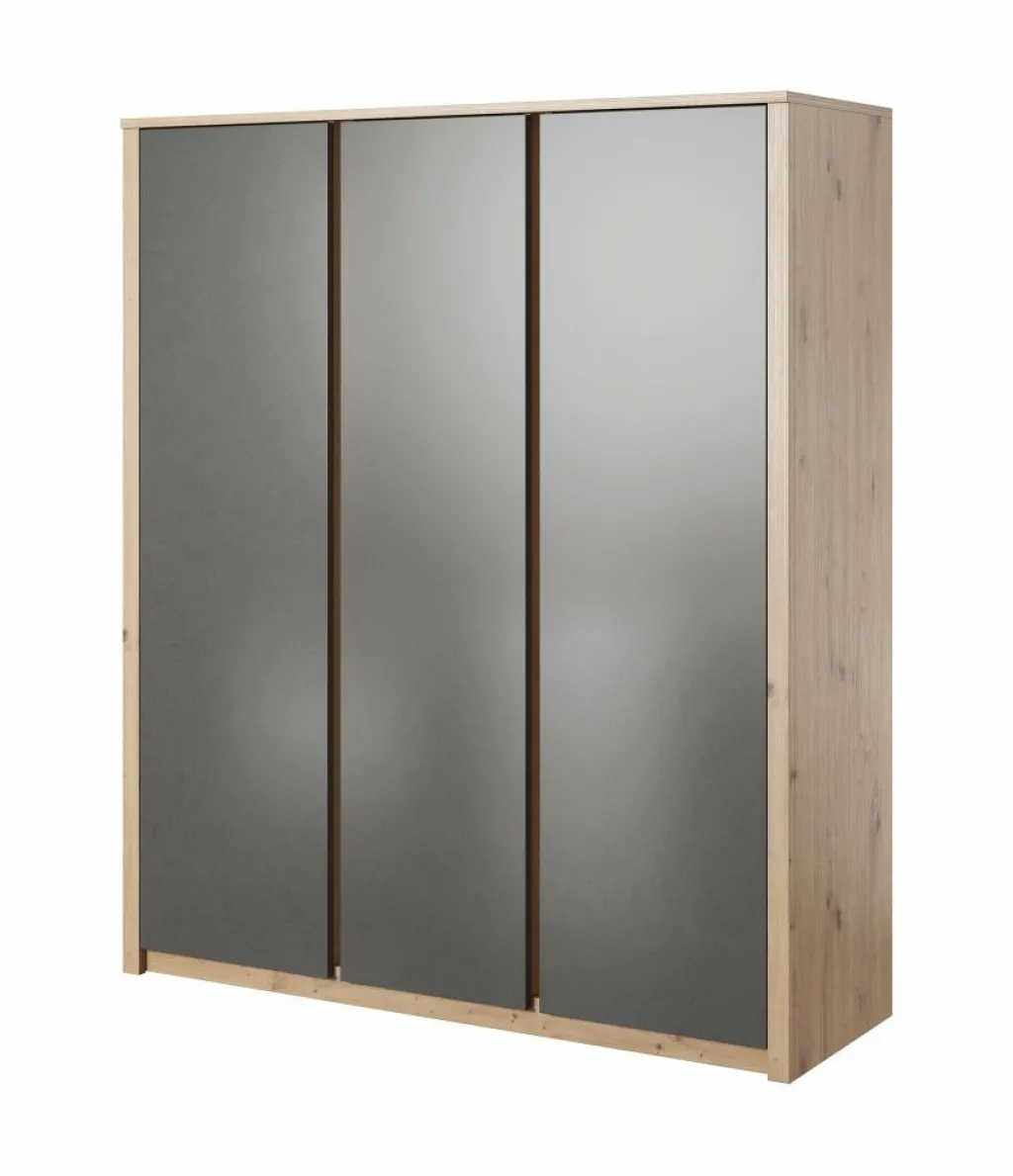 Garderobekast Melody is een robuuste, stijlvolle kledingkast met ruim voldoende opbergmogelijkheden. Het meubel is uitgevoerd in een combinatie van eiken met grijs welke zorgt voor een frisse uitstraling en geschikt is voor zowel landelijke als moderne slaapkamers. Er zijn 3 deuren te vinden met daarachter een zee aan opbergruimte. Aan de linker- en rechterkant zijn metalen stangen geplaatst waaraan je kleding kunt ophangen. Daarboven zijn schappen geplaatst waar je bijvoorbeeld schoenen of accessoires op kan bergen. Tot slot zijn er in het midden van de kast vijf ruime schappen geplaatst. Garderobekast Melody maakt deel uit van een uitgebreid woonprogramma waarmee je een totaal nieuwe stijl in huis kan creëren.