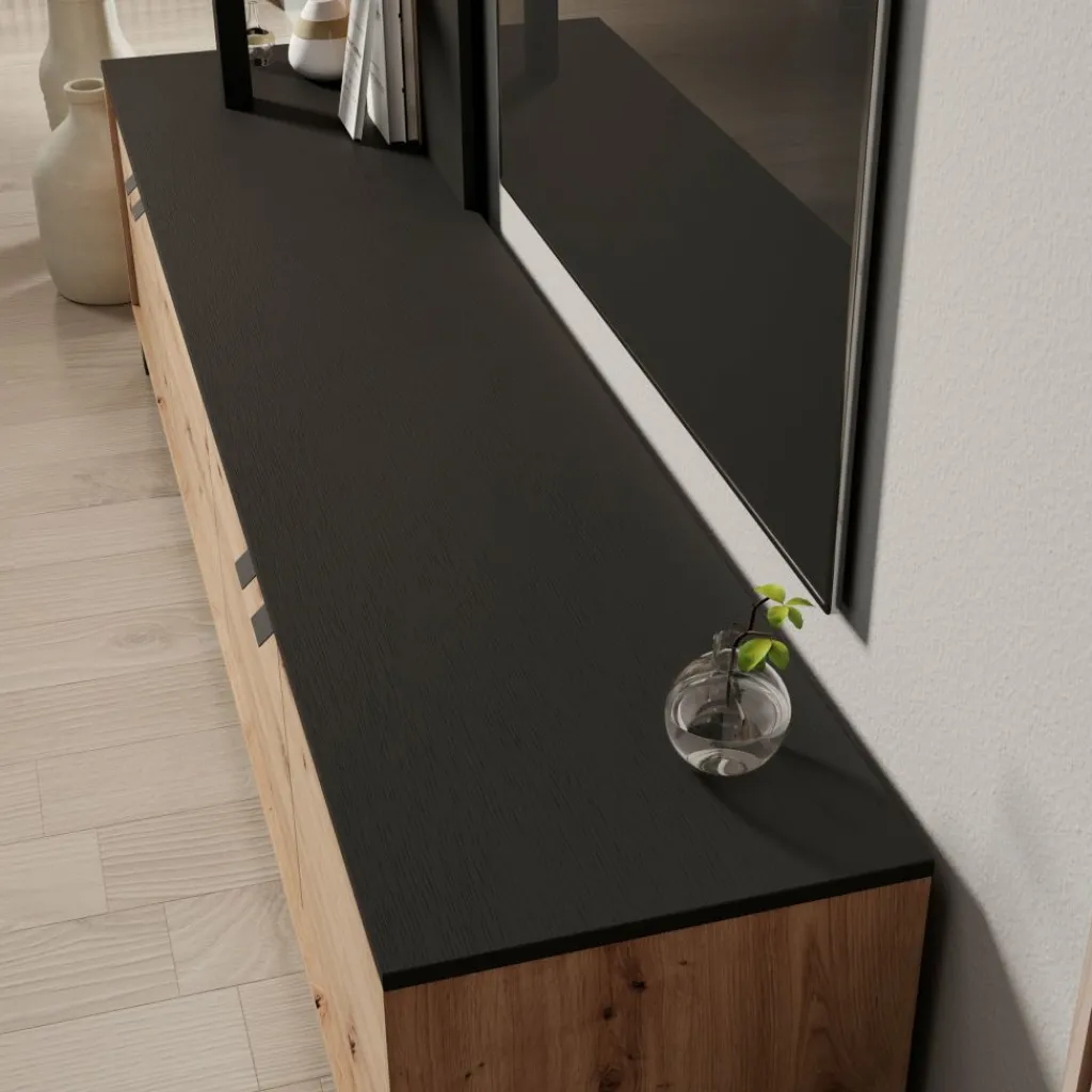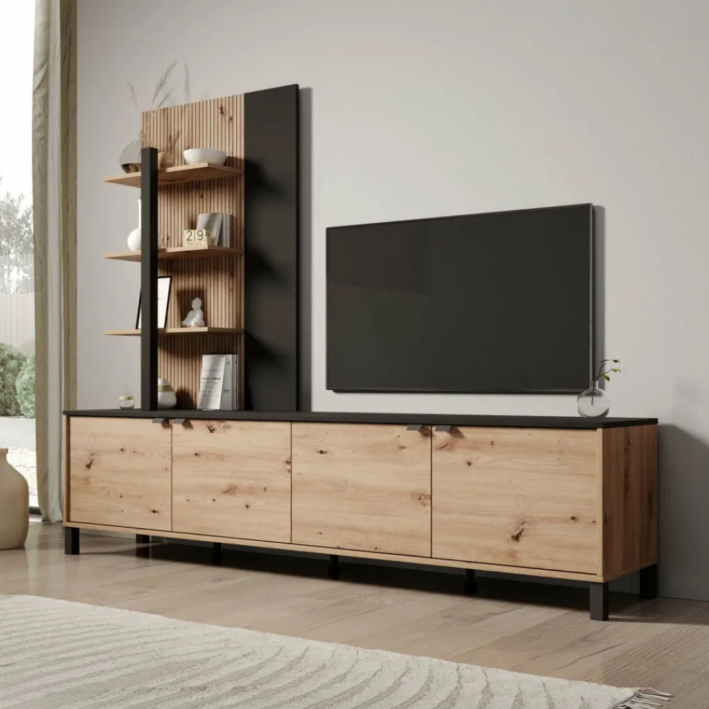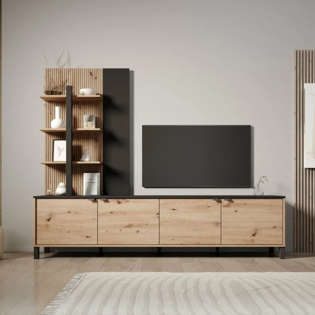 Het wandmeubel bestaat uit een laag tv-meubel met meerdere deurtjes en een hoge open kast aan de linkerzijde. De open kast is voorzien van meerdere open vakken, terwijl het lage meubel gesloten opbergruimte biedt. Het bovenblad van het tv-meubel is geschikt voor het plaatsen van een televisie en accessoires. Het geheel staat op poten en is vrij van de vloer geplaatst.
