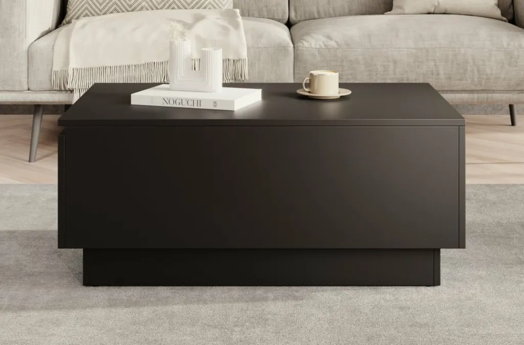 Salontafel Micha is een rechthoekige salontafel met een moderne uitstraling uitgevoerd in mat zwart. Het tafelblad is open te klappen waardoor je over handige opbergruimte beschikt. Deze klep is te openen met de opening aan de zijkant.
