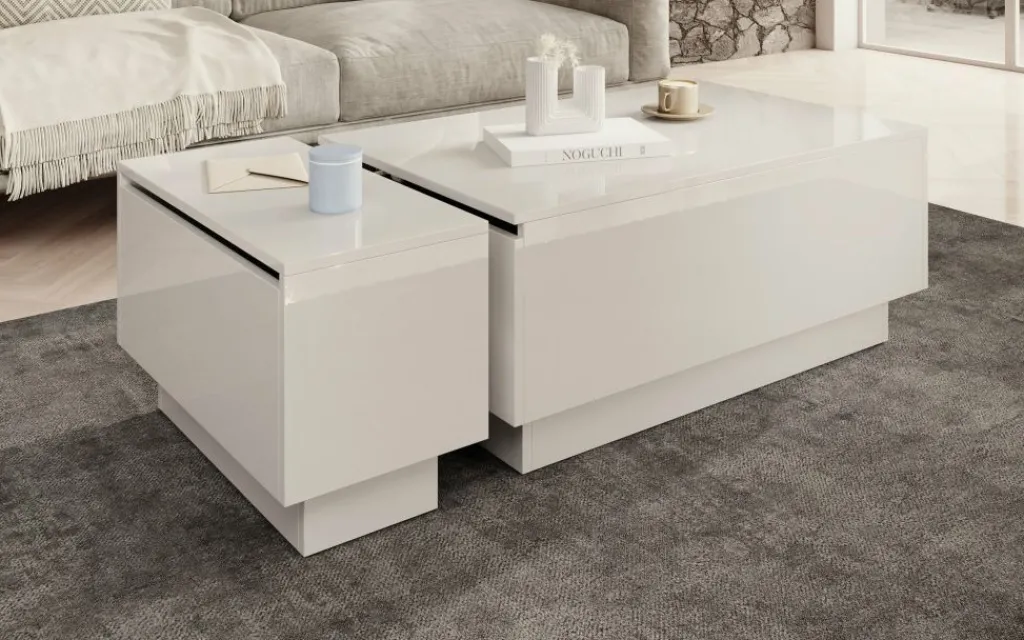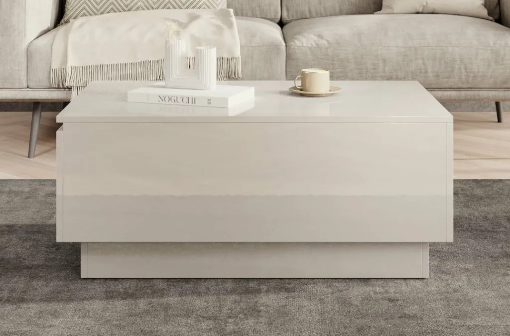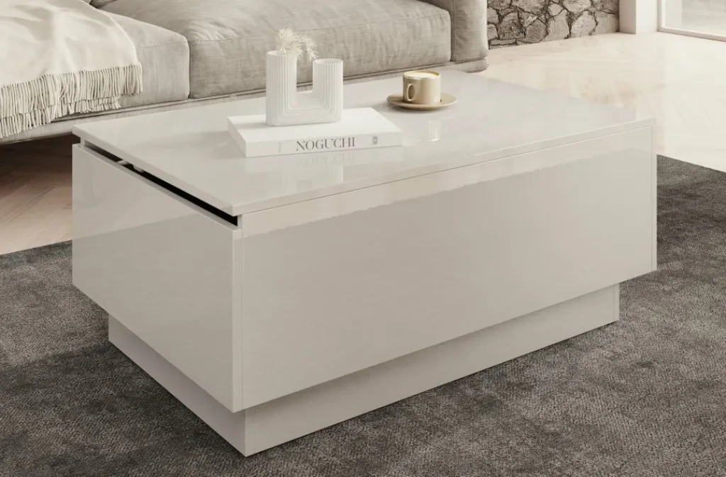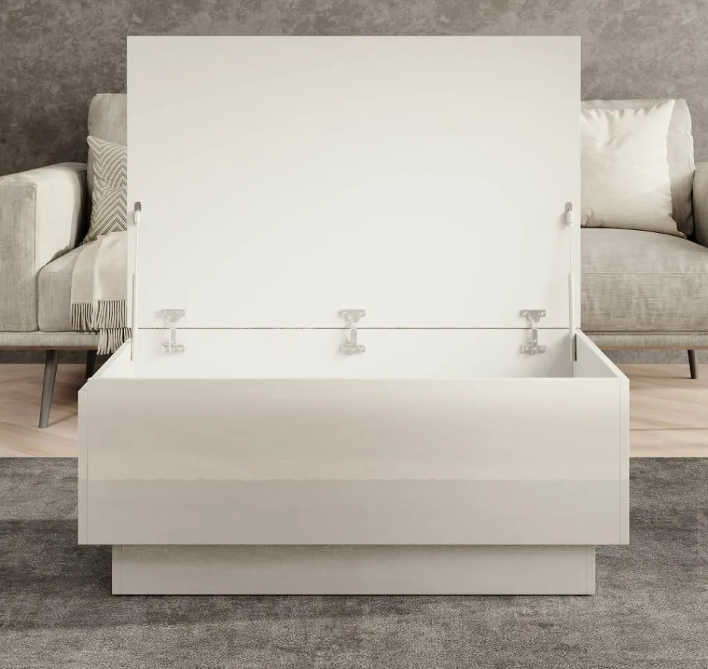 Salontafel Micha is een rechthoekige salontafel met een moderne uitstraling uitgevoerd in hoogglans wit. Het tafelblad is open te klappen waardoor je over handige opbergruimte beschikt. Deze klep is te openen met de opening aan de zijkant.