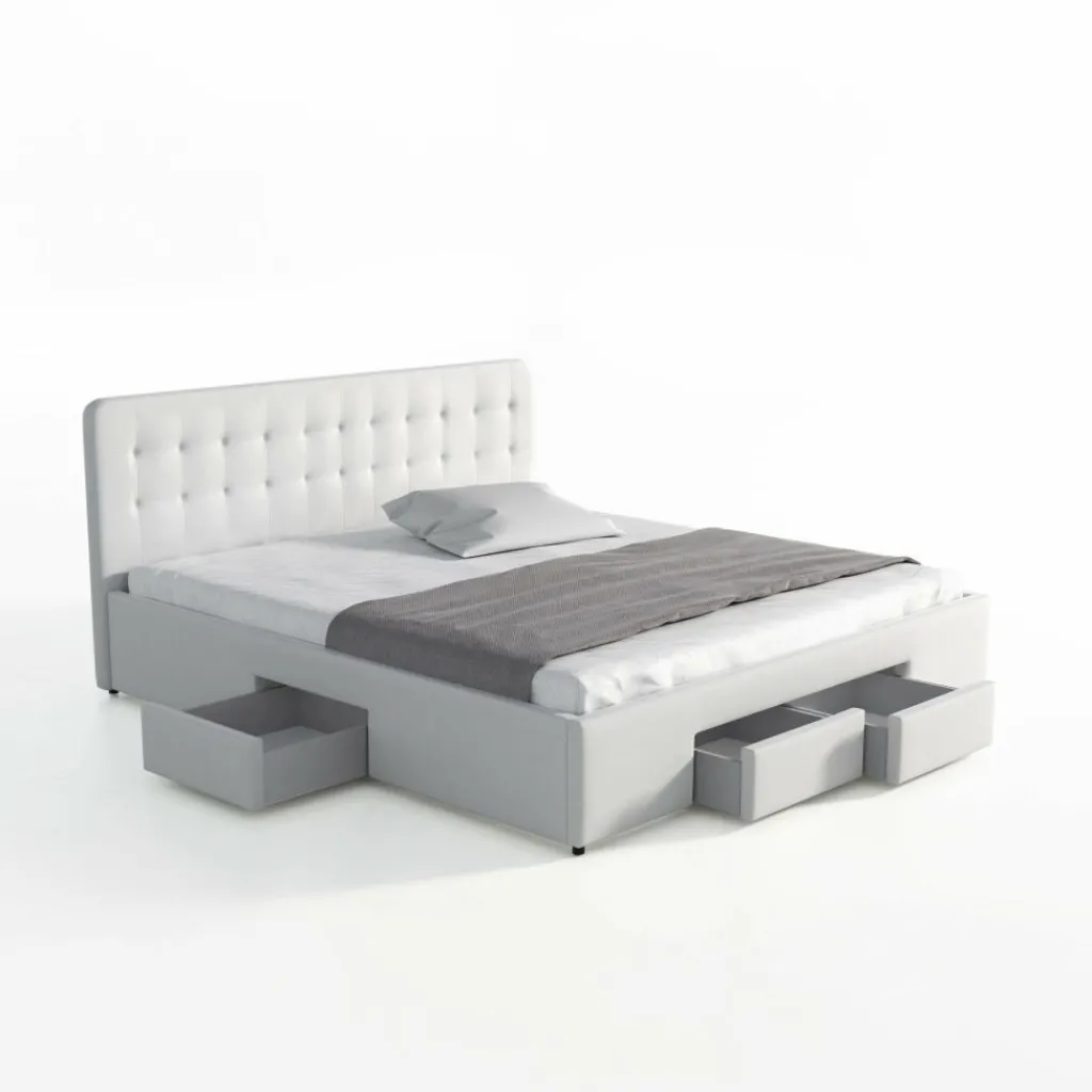 Tweepersoonsbed Milo is een opvallend, modern bed en een echte eyecatcher. Dit model is afgewerkt met onderhoudsvriendelijk, deels gecapitonneerd, kunstleer in de kleur wit. Het bed beschikt over een stevige constructie inclusief hoofdbord, voetbord en zijpanelen en staat op kunststoffen pootjes van 4 cm hoog. Bij de prijs is ook een standaard lattenbodem inbegrepen. Een matras wordt niet bijgeleverd. Het bed is ontzettend praktisch aangezien er in totaal vier lades in geplaatst zijn: twee bij het voetenbord en aan de linker- en rechterkant ook nog één. Tweepersoonsbed Milo heeft een draagvermogen van 100 kg per ligzijde.