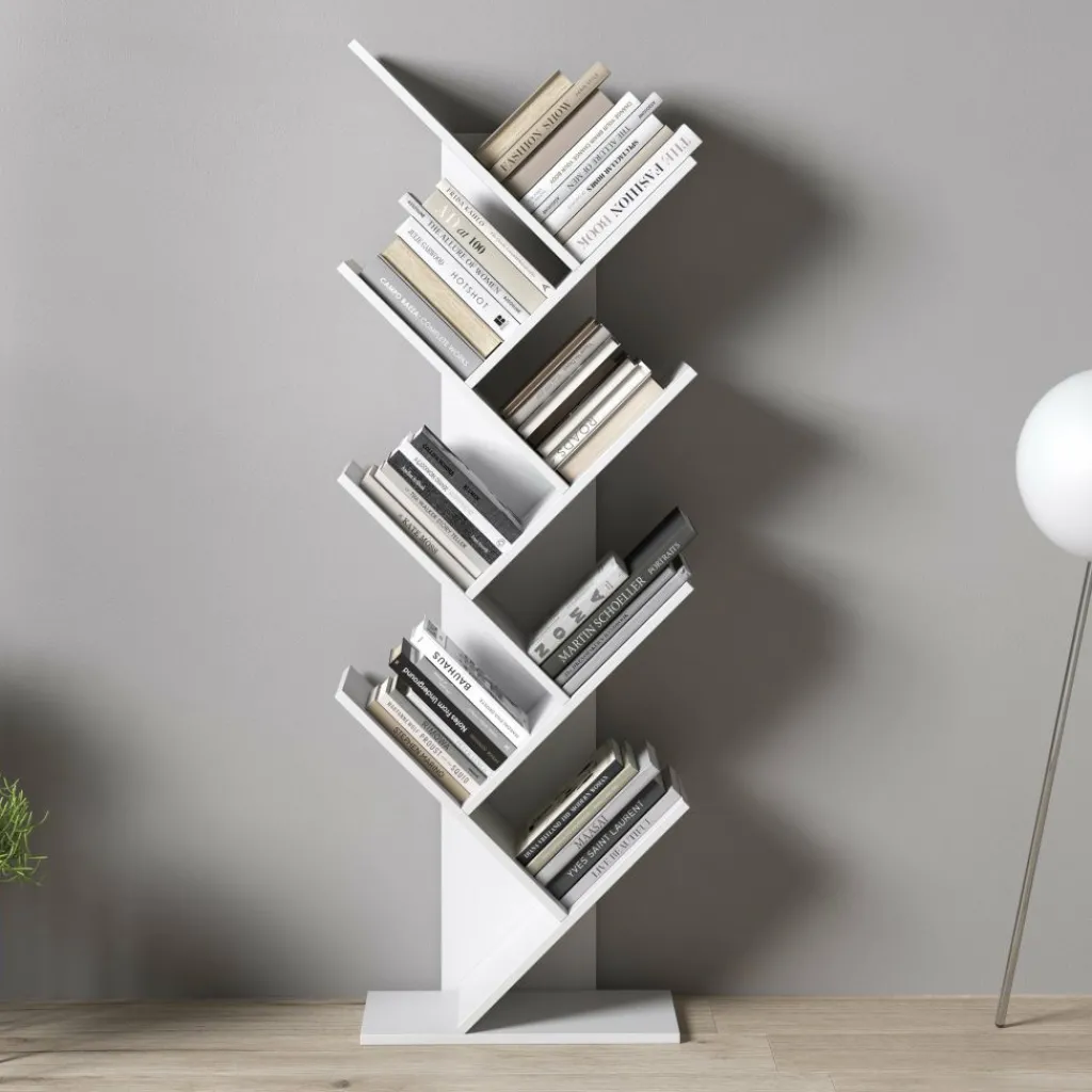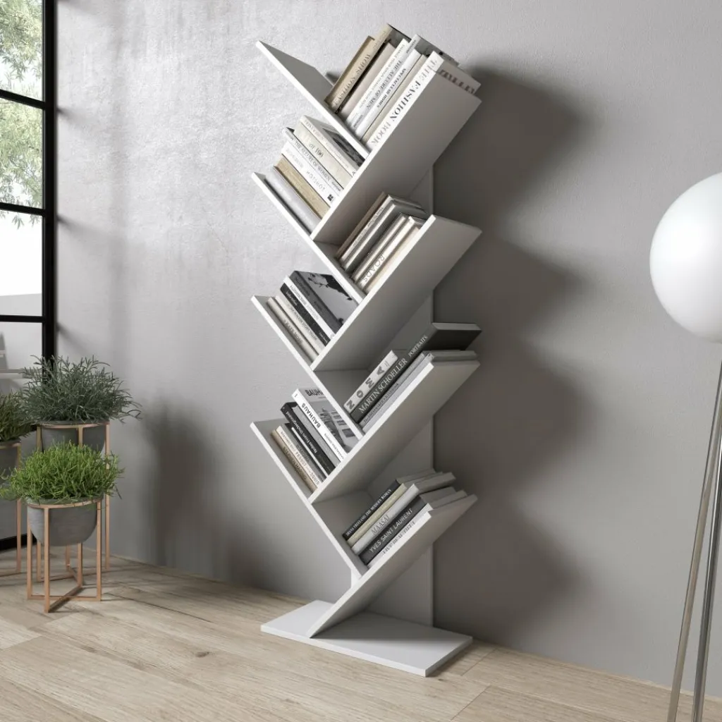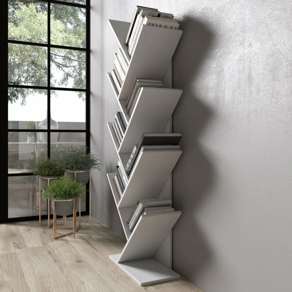 De kast is opgebouwd uit meerdere schuin geplaatste legvlakken die trapsgewijs langs de verticale achterplaat zijn gemonteerd. Deze indeling biedt ruimte voor het opbergen en presenteren van boeken, tijdschriften of decoratieve objecten. Elk legvlak is afzonderlijk toegankelijk en houdt de inhoud zichtbaar.