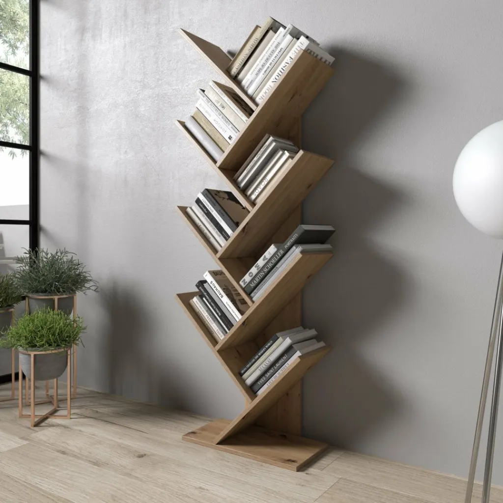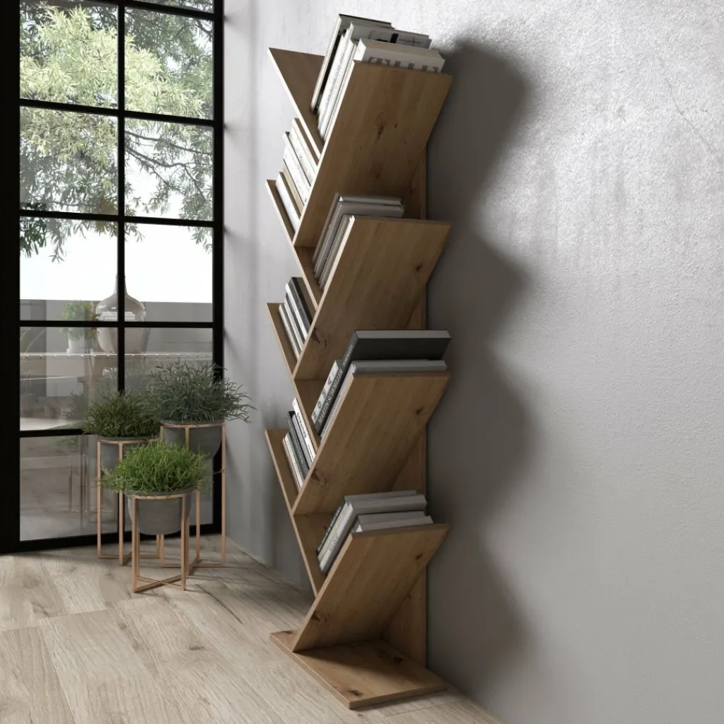 De kast is opgebouwd uit meerdere schuin geplaatste legvlakken die trapsgewijs langs de verticale achterplaat zijn gemonteerd. Deze indeling biedt ruimte voor het opbergen en presenteren van boeken, tijdschriften of decoratieve objecten. Elk legvlak is afzonderlijk toegankelijk en houdt de inhoud zichtbaar.