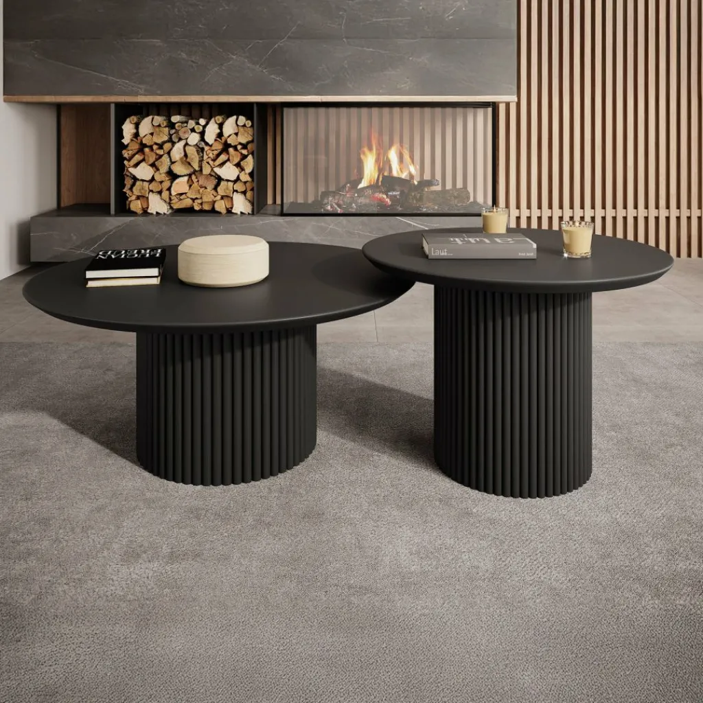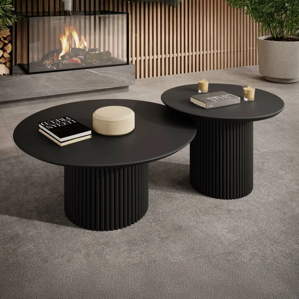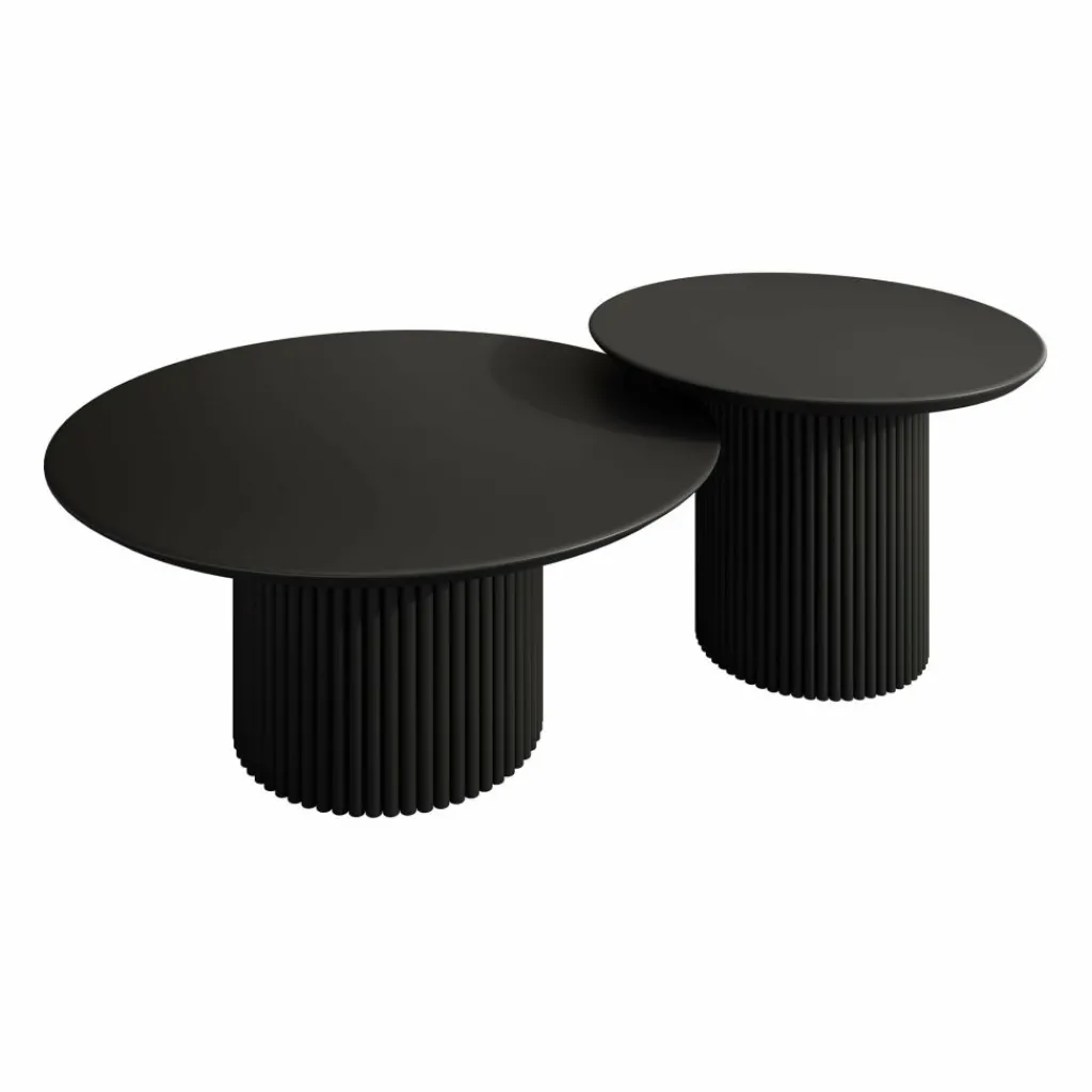 Beide tafels zijn uitgevoerd in een egale zwarte kleur en voorzien van een cilindervormige poot met verticale groeven. Het ronde tafelblad sluit hier strak op aan en vormt samen met de poot één geheel. De zwarte afwerking geeft de set een krachtig en modern karakter.