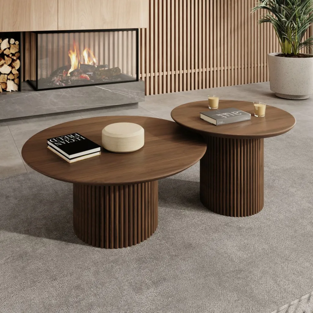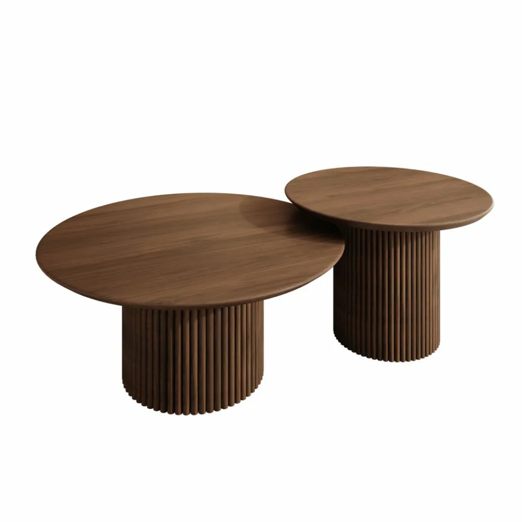 Beide tafels zijn uitgevoerd in een walnootpatroon en voorzien van een cilindervormige poot met verticale groeven. Het ronde tafelblad sluit hier strak op aan en vormt samen met de poot één geheel. Het walnootpatroon geeft de set een warme houtlook die goed te combineren is met diverse interieurstijlen.