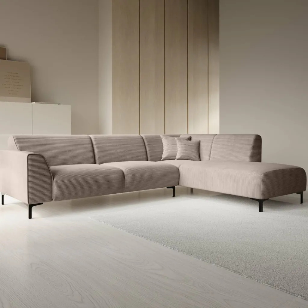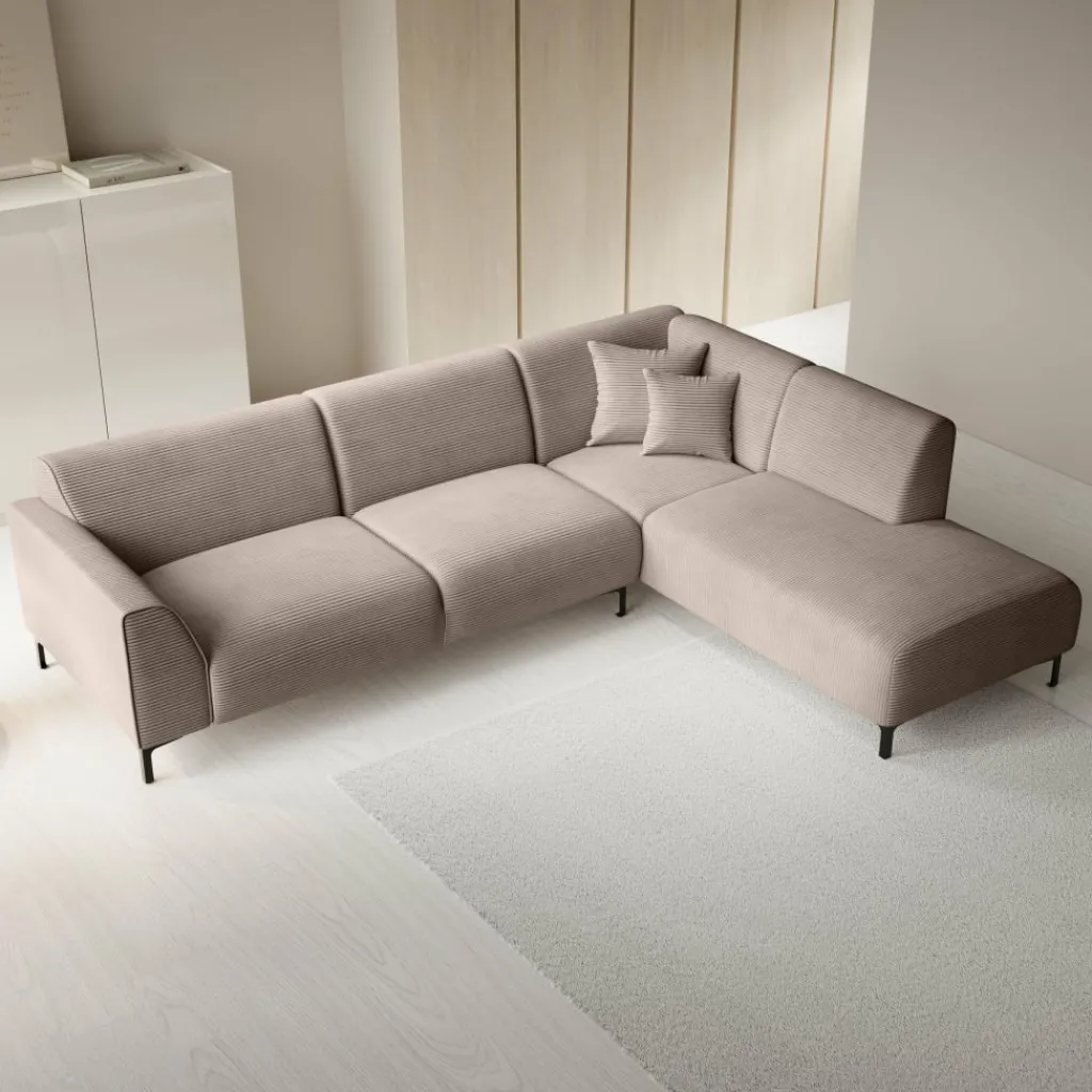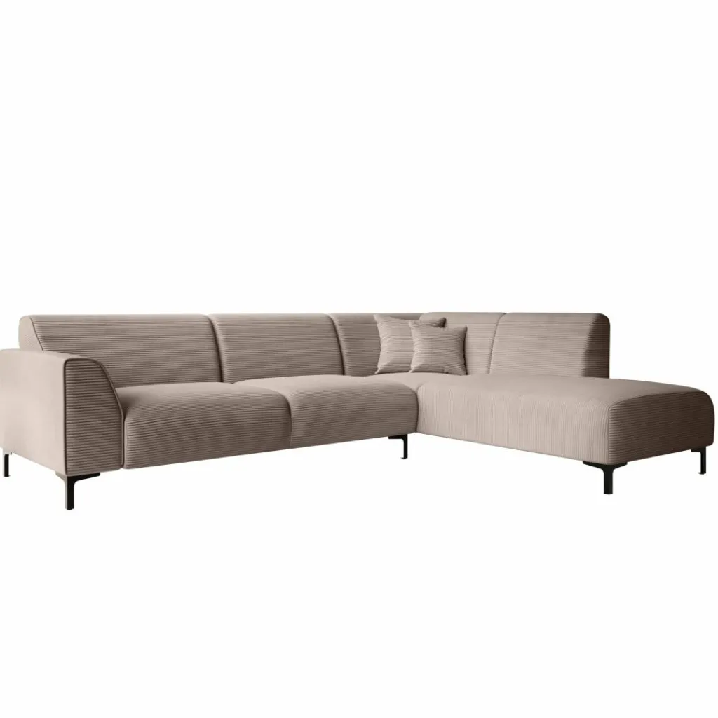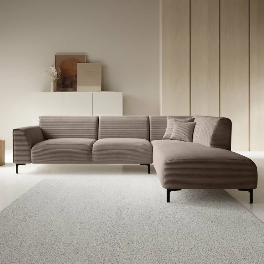 Hoekbank Moana is een moderne bank gemaakt van ribstof. Dit model is geschikt voor 4 tot 5 personen. Naast de 2-zitter is de bank voorzien van een lounge-deel. De hoekbank is bekleed met een bruine zachte ribstof en staat op hoge, zwart metalen pootjes. De Moana bestaat uit zowel vaste rugkussens als uit vaste zitkussens en wordt met 2 bijpassende sierkussentjes geleverd.
