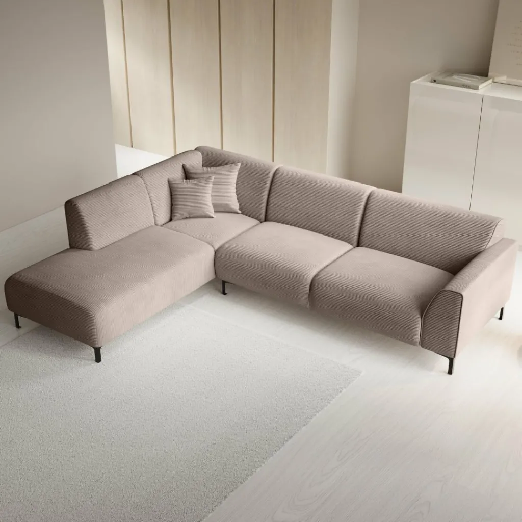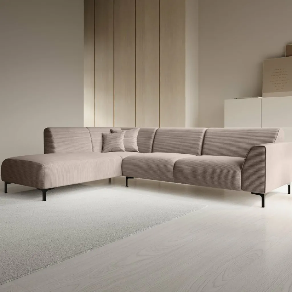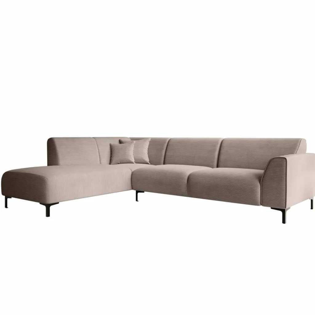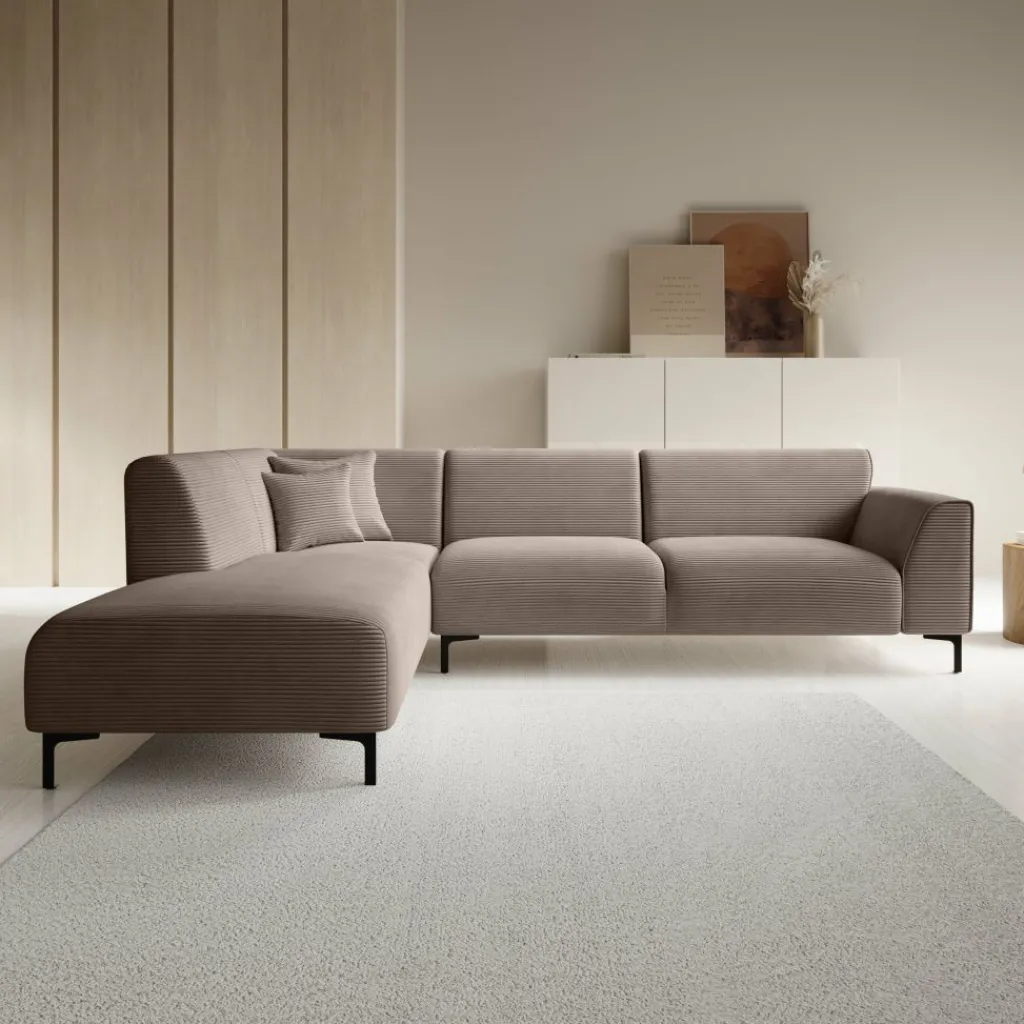 Hoekbank Moana is een moderne bank gemaakt van ribstof in bruine kleur. Dit model is geschikt voor 4 tot 5 personen. Naast de 2-zitter is de bank voorzien van een lounge-deel. De hoekbank staat op hoge, zwart metalen pootjes. De Moana bestaat uit zowel vaste rugkussens als uit vaste zitkussens en wordt met 2 bijpassende sierkussentjes geleverd.
