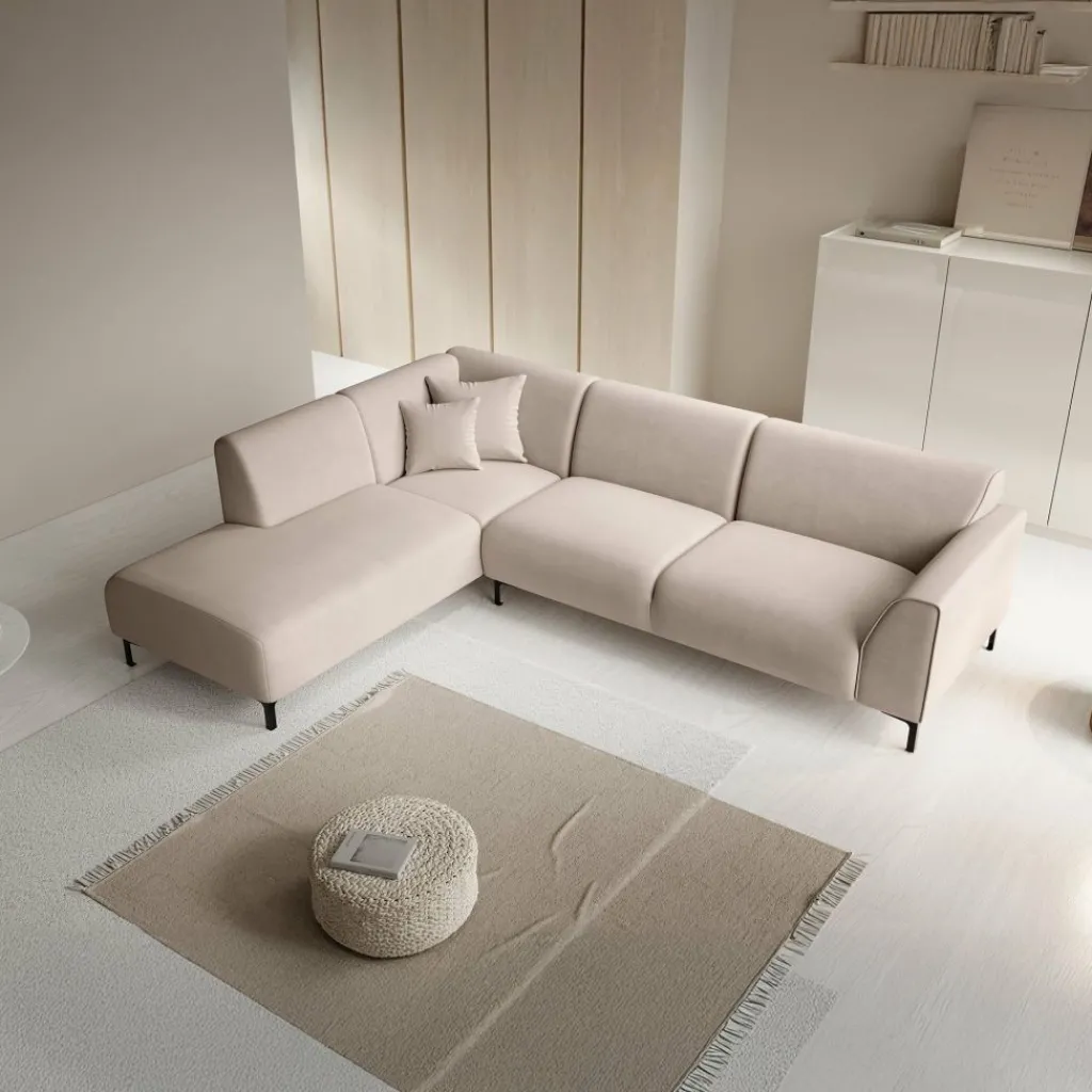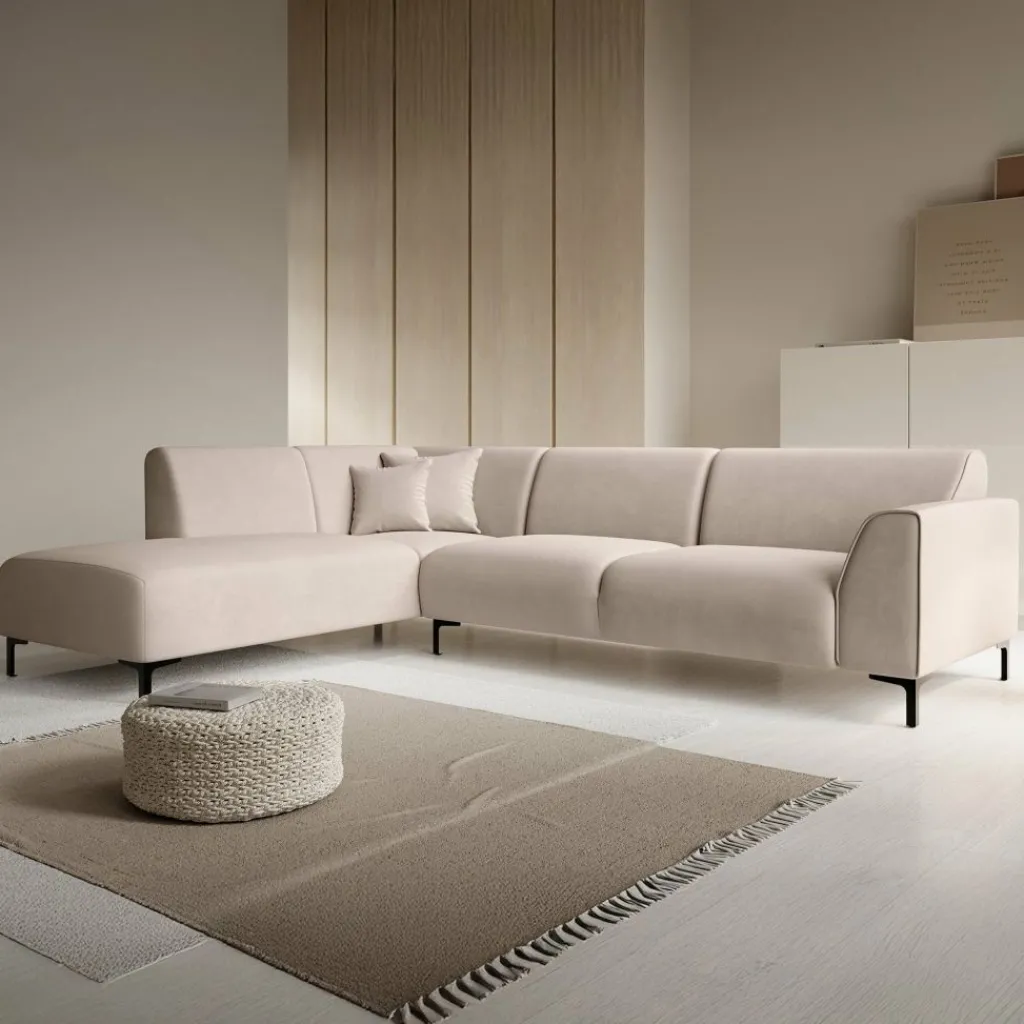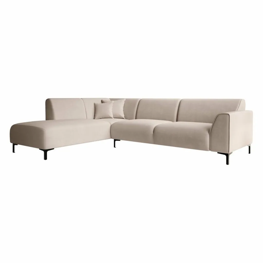 Hoekbank Moana is een moderne bank gemaakt van stof. Dit model is geschikt voor 4 tot 5 personen. Naast de 2-zitter is de bank voorzien van een lounge-deel. De hoekbank is bekleed met een beige zachte stof en staat op hoge, zwart metalen pootjes. De Moana bestaat uit zowel vaste rugkussens als uit vaste zitkussens en wordt met 2 bijpassende sierkussentjes geleverd.