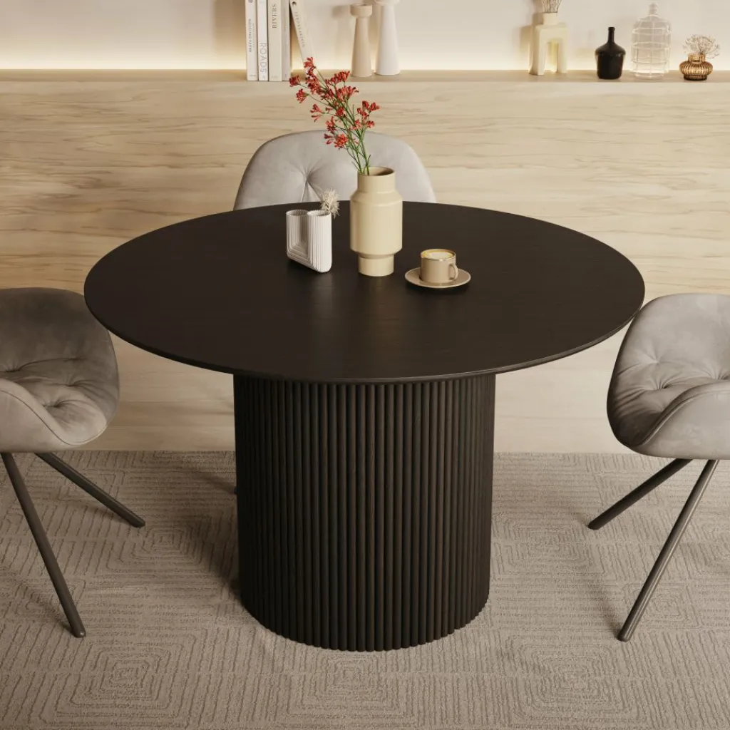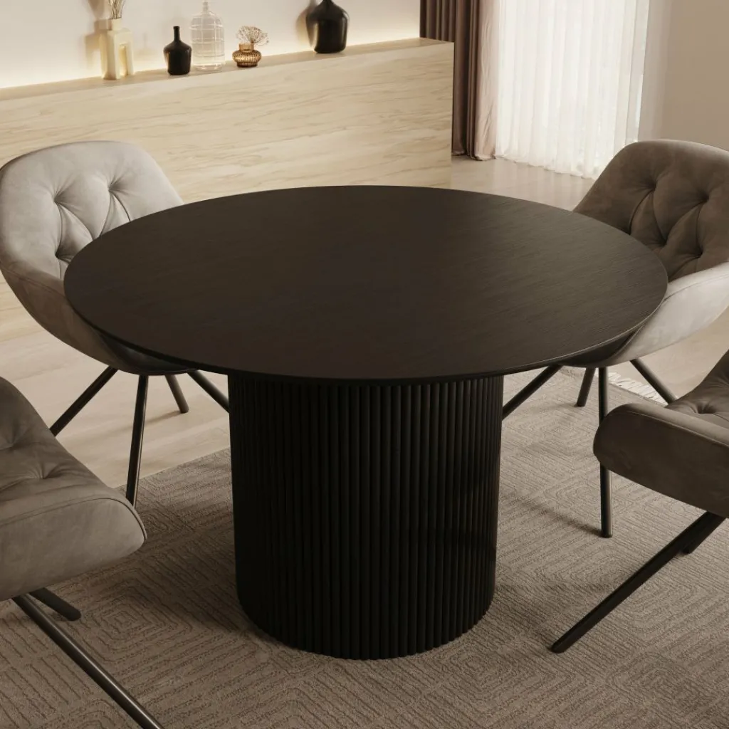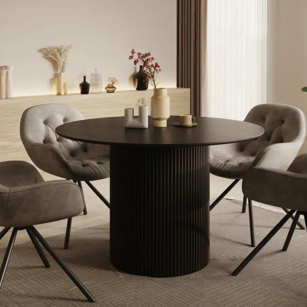 De Modena eetkamertafel is een stijlvolle eyecatcher die luxe en functionaliteit perfect weet te combineren. Met zijn ronde blad en opvallende centrale kolompoot met verticale structuur brengt deze tafel een eigentijdse en verfijnde sfeer in jouw eetkamer. Dankzij de royale diameter van 120 cm biedt Modena comfortabel plaats aan vier personen, ideaal voor gezellige diners, lange avonden tafelen of een borrelmoment met vrienden.