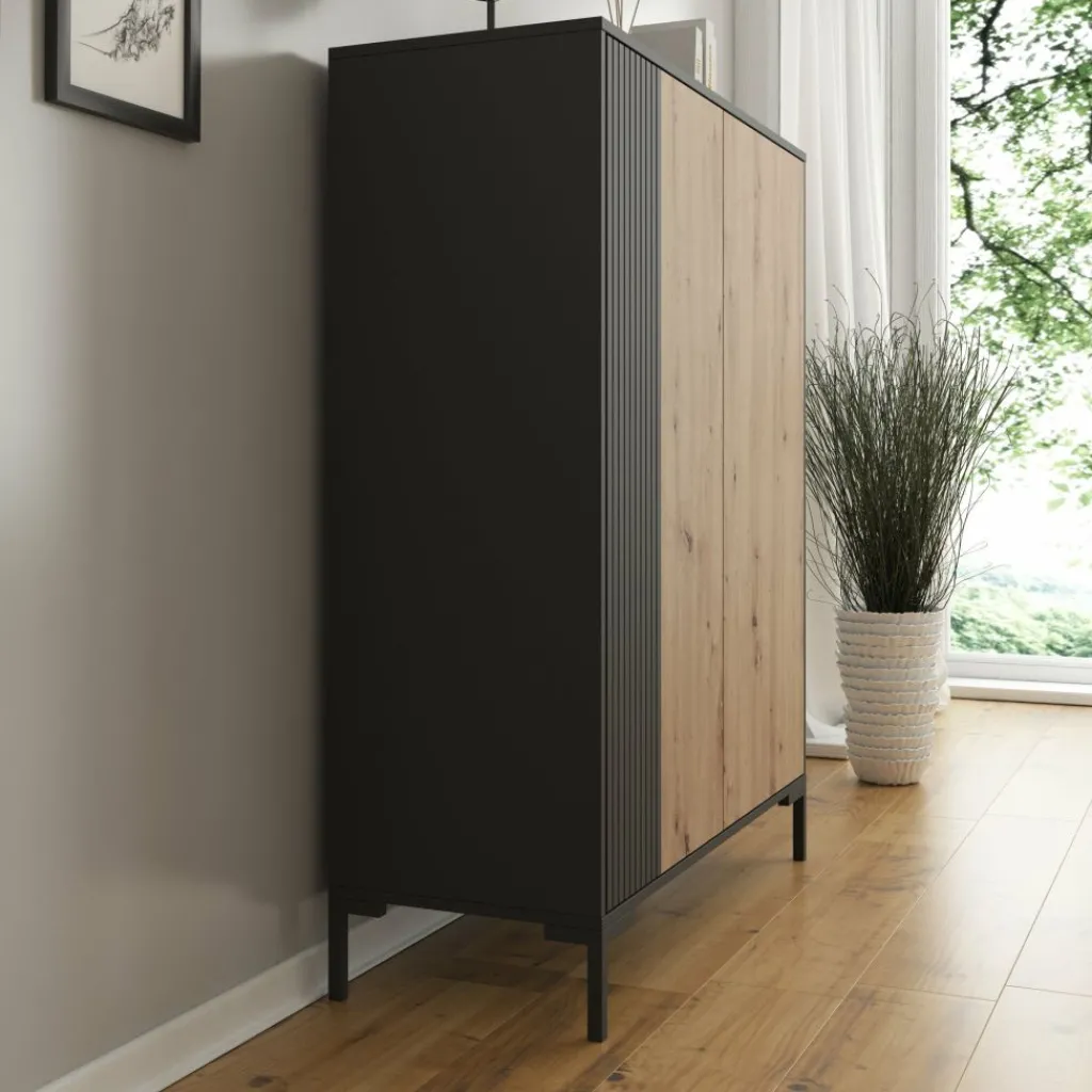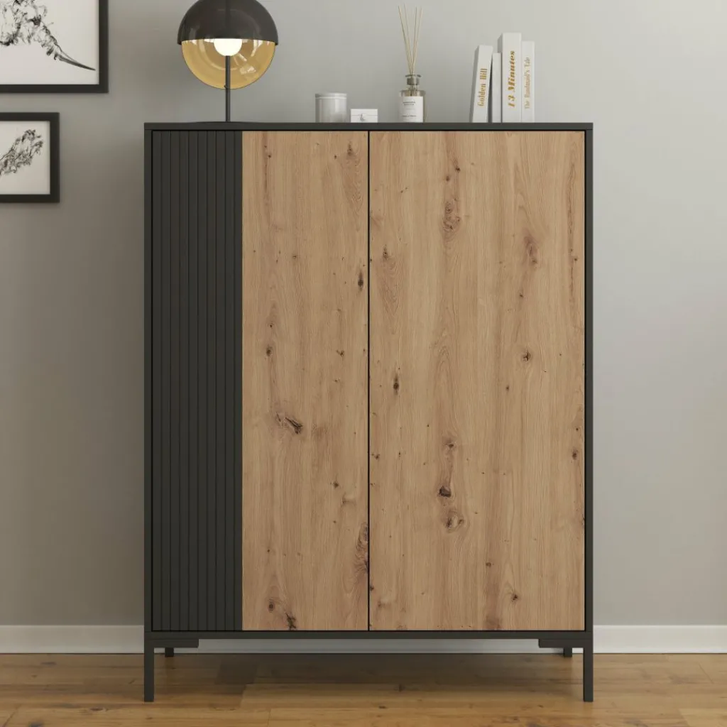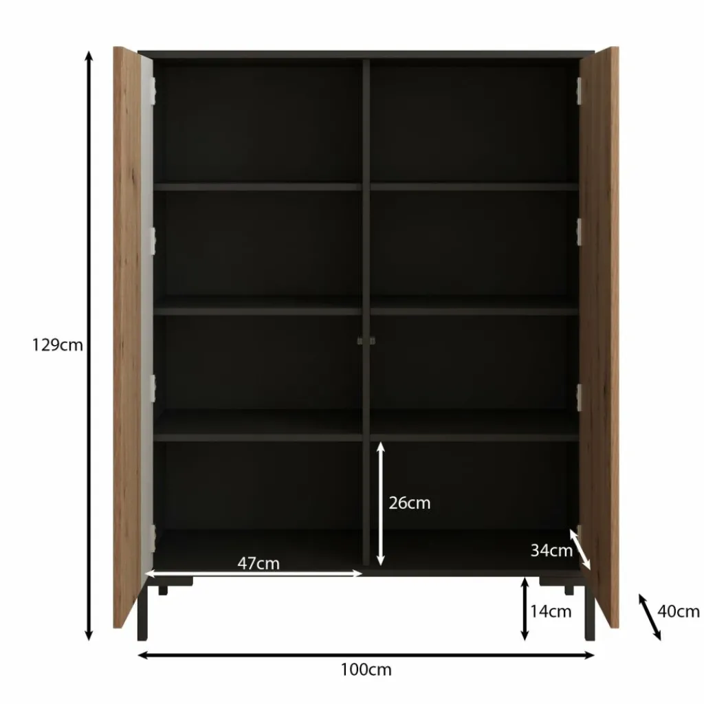 Dressoir Molina is een opbergkast in een industriële stijl. De kast beschikt over 2 deuren die openen met het push to open systeem. Achter de deuren zitten in totaal 8 opbergvakken. De Molina is uitgevoerd in de kleur eiken met zwart en staat op metalen poten.