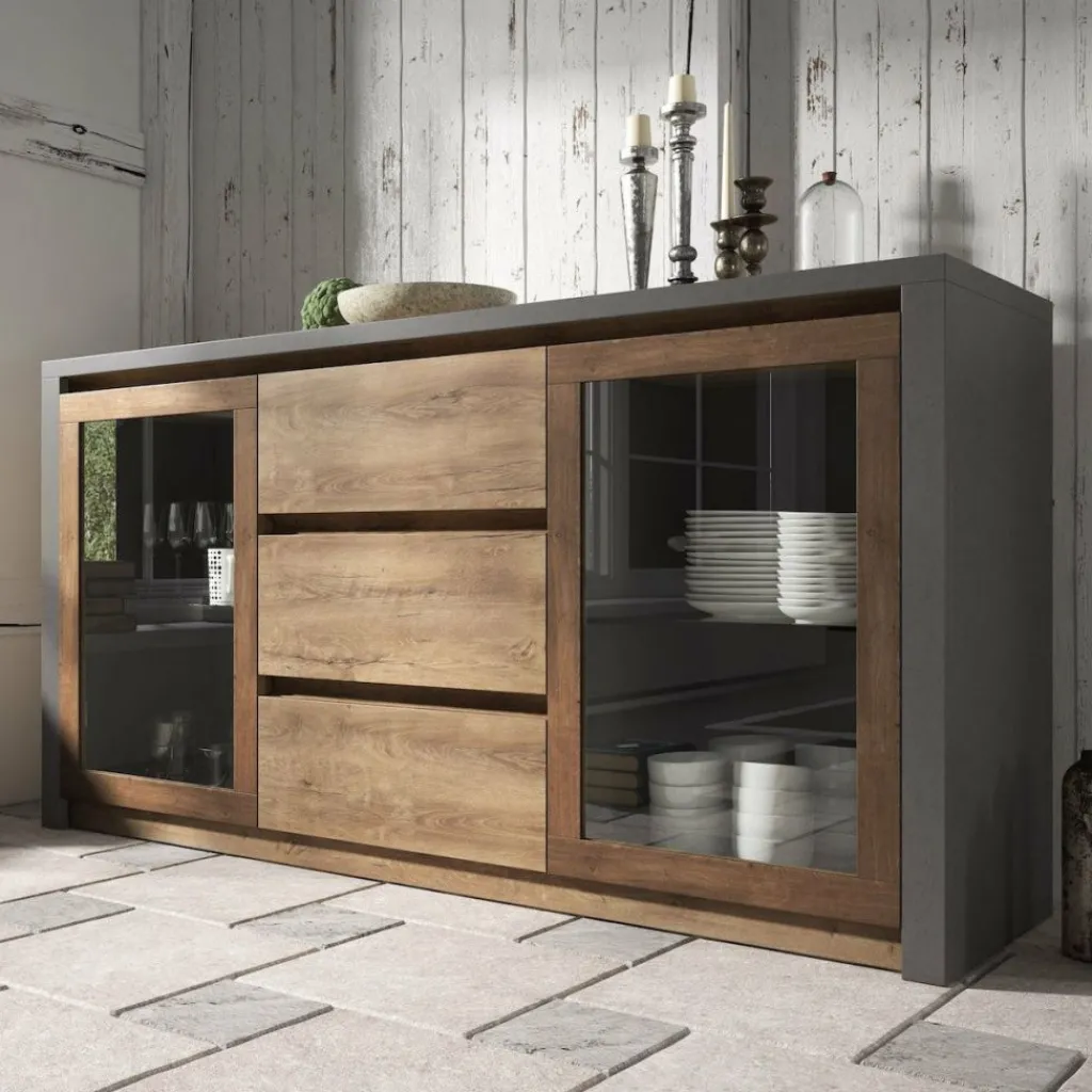 Dressoir Monaco is een robuuste en opvallende designkast met veel opbergruimte. Dit meubel is afgewerkt in een neutrale, maar warme eiken kleur in combinatie met een stoere mat grijze ombouw. De kast beschikt over 3 lades in het midden en twee deuren met glasplaten aan de zijkanten. Achter deze deuren zijn nog glazen schappen geplaatst.