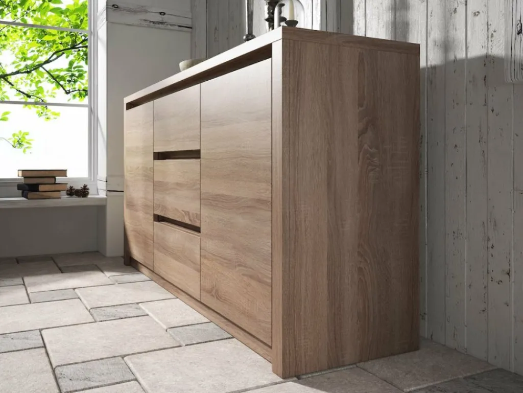 Dressoir Monaco is een landelijk dressoir gemaakt van hout in truffel eiken kleur. Het dressoir is voorzien van 2 deuren en 3 lades. Vanwege de robuuste uitstraling is het dressoir een eyecatcher en vult net dat lege plekje in de woonkamer op.