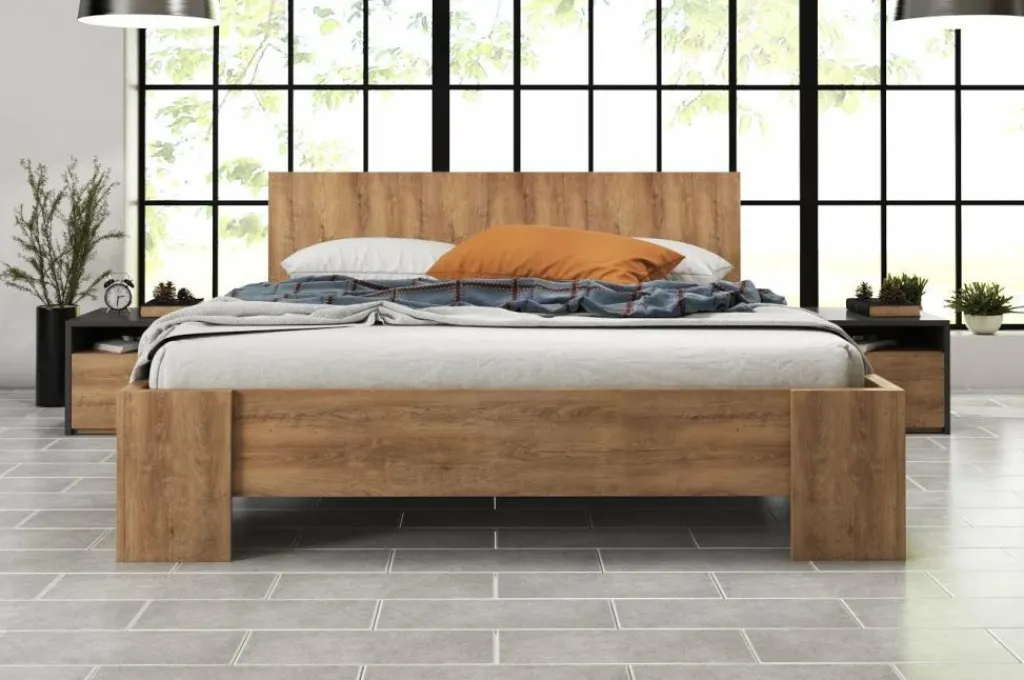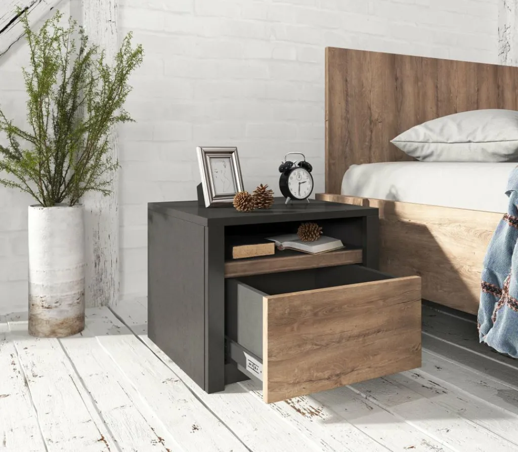 De Monaco slaapkamer straalt rust en eenvoud uit, met een moderne twist. De warme eikenhoutlook en strakke grijze accenten zorgen voor een stijlvolle combinatie die makkelijk te integreren is in elke slaapkamer. Deze set biedt een complete basis voor je interieur: een tweepersoonsbed, twee nachtkastjes en een ruime kledingkast in dezelfde afwerking.