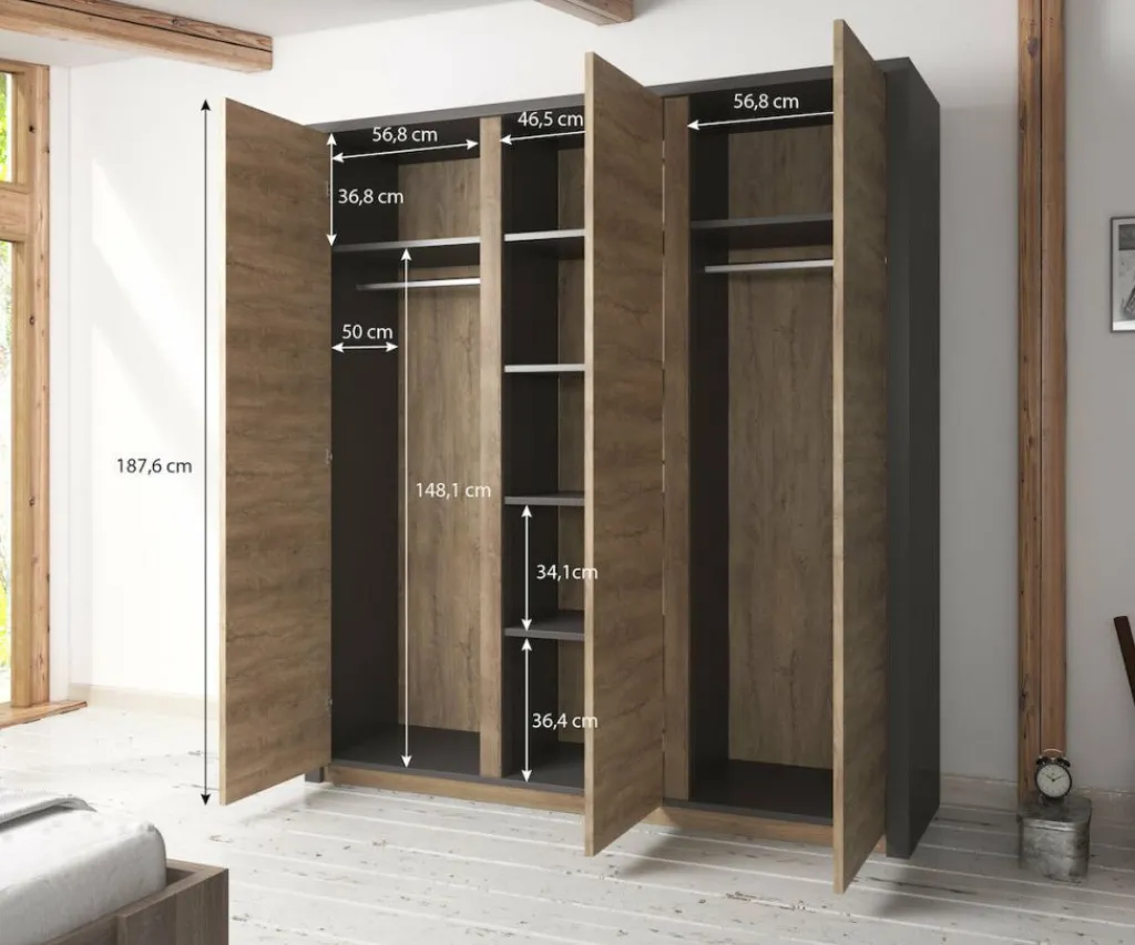 Het bedframe (geschikt voor 160×200 cm matrassen) is robuust uitgevoerd en wordt geleverd met een lattenbodem. De nachtkastjes zijn compact en functioneel, met een open vak en een lade voor alles wat je graag bij de hand hebt. De kledingkast met drie scharnierdeuren heeft een doordachte indeling: zeven legplanken en drie kledingroedes zorgen voor overzicht en ruimte.
