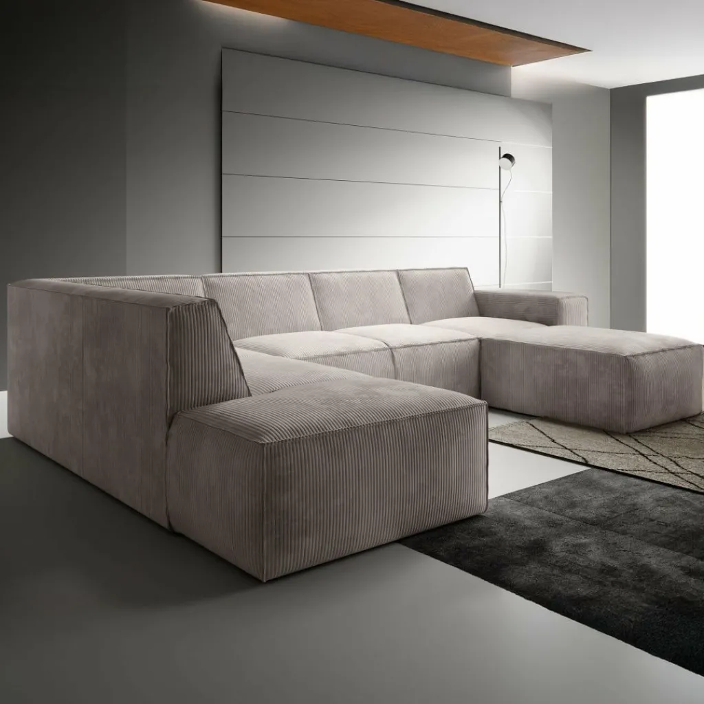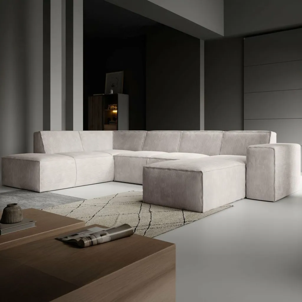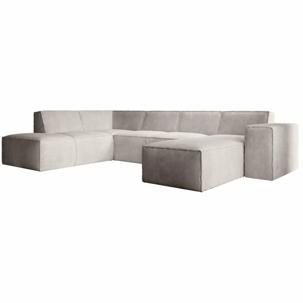 Hoekbank Monet XL is een royale loungebank met plek voor 6 tot 7 personen. De bank is uitgevoerd in een zachte ribstof in beige kleur en heeft een moderne, uitnodigende uitstraling.