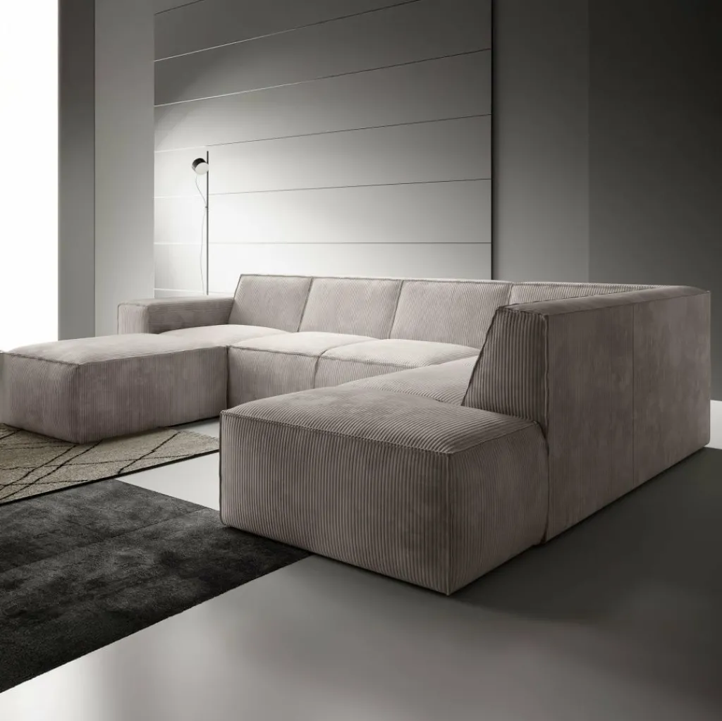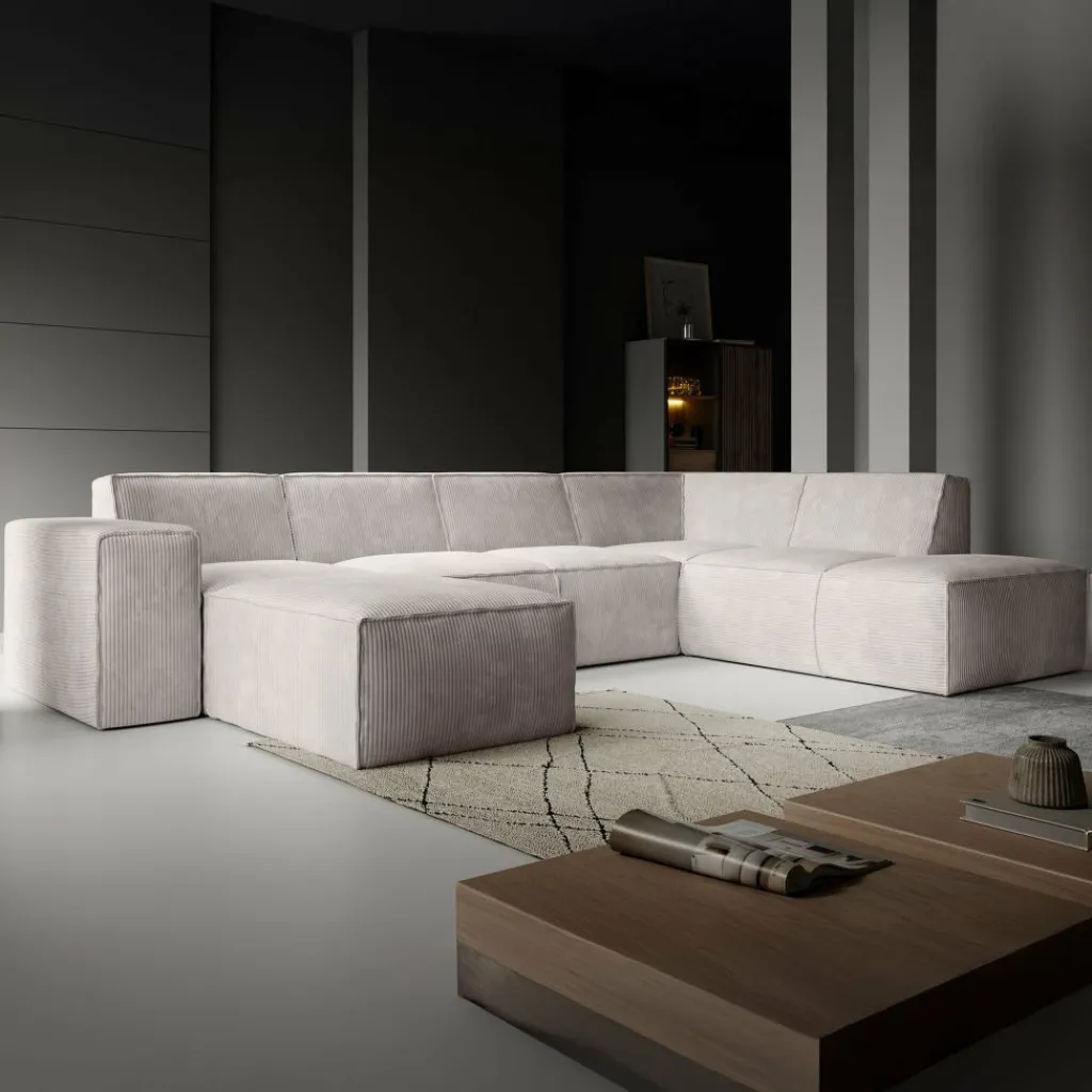 Hoekbank Monet XL is een royale loungebank met plek voor 6 tot 7 personen. De bank is uitgevoerd in een zachte ribstof in beige kleur en heeft een moderne, uitnodigende uitstraling.