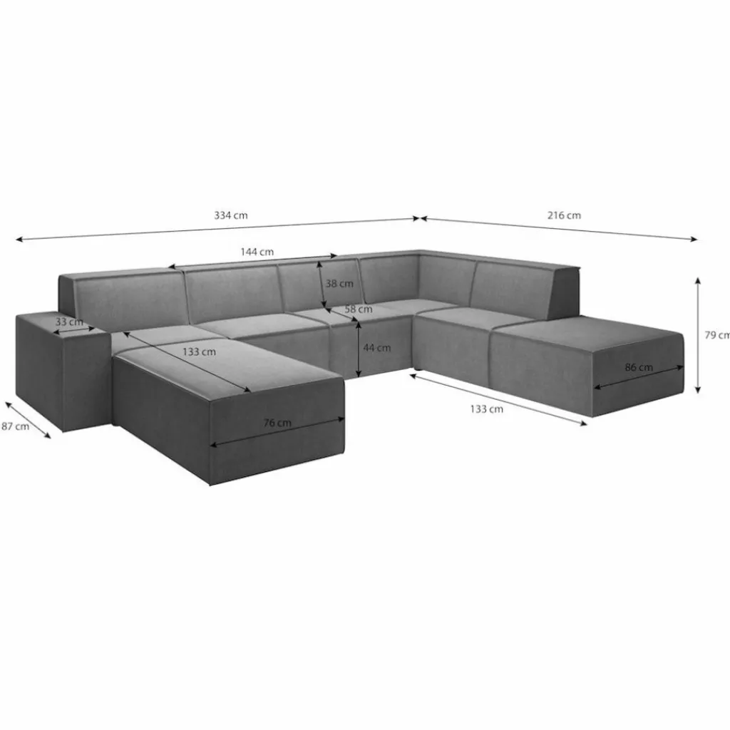 Het model bestaat uit een ruime chaise longue aan de linkerkant (vanuit vooraanzicht), een brede 2-zits, een hoekelement en een 2,5-zits aan de rechterzijde. De zit- en rugkussens zijn stevig vastgestikt en afgewerkt met een opvallende grove naad langs de randen. De bank staat op lage, ronde pootjes.