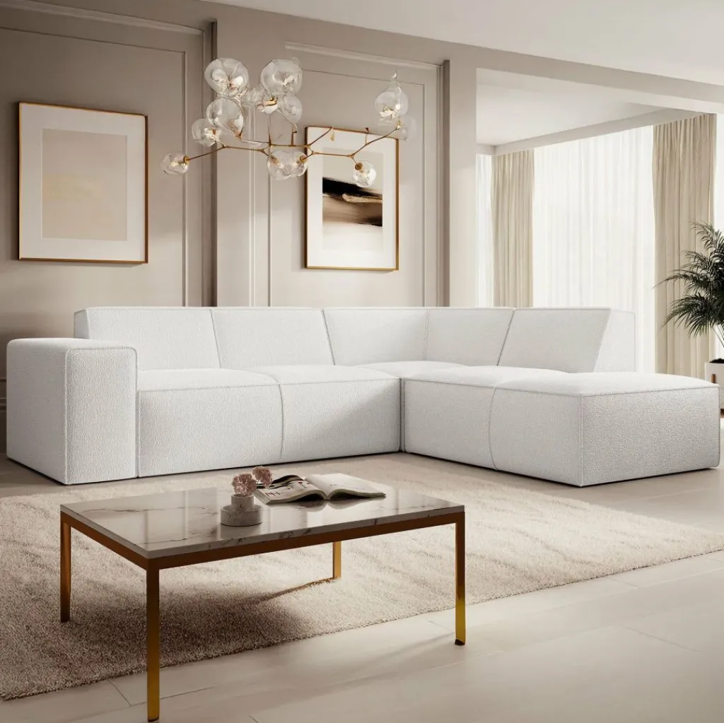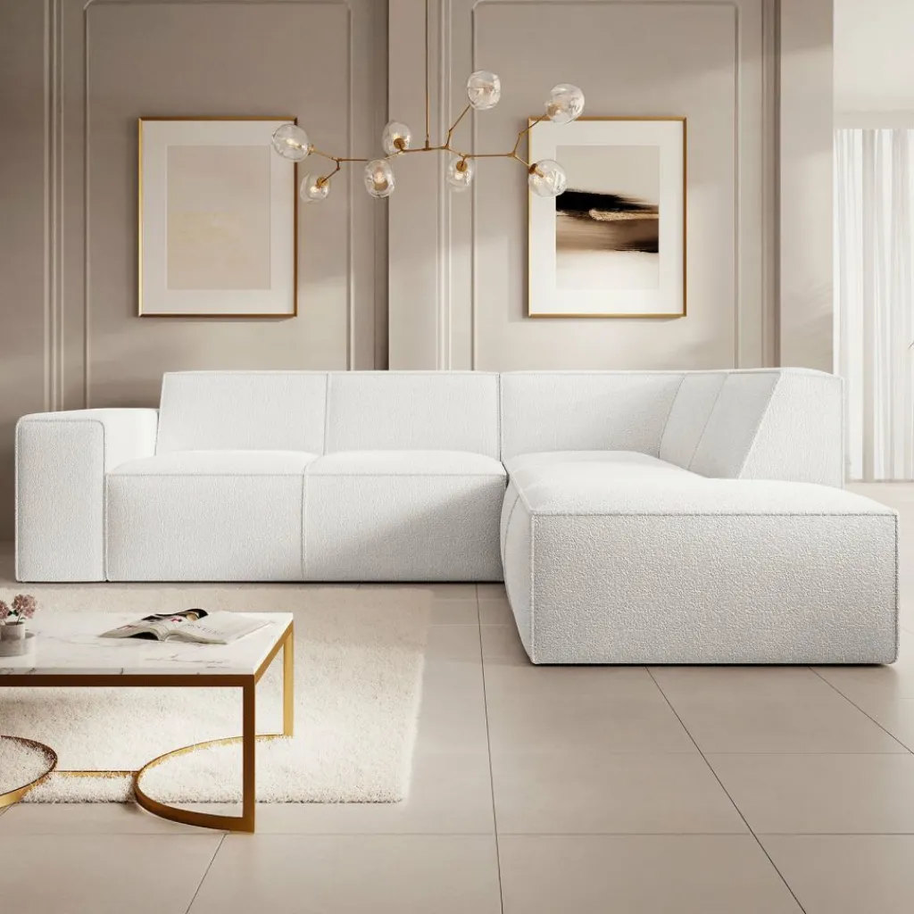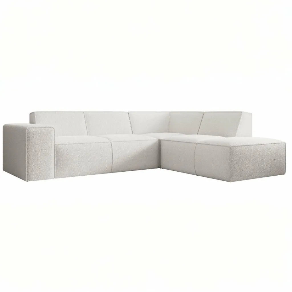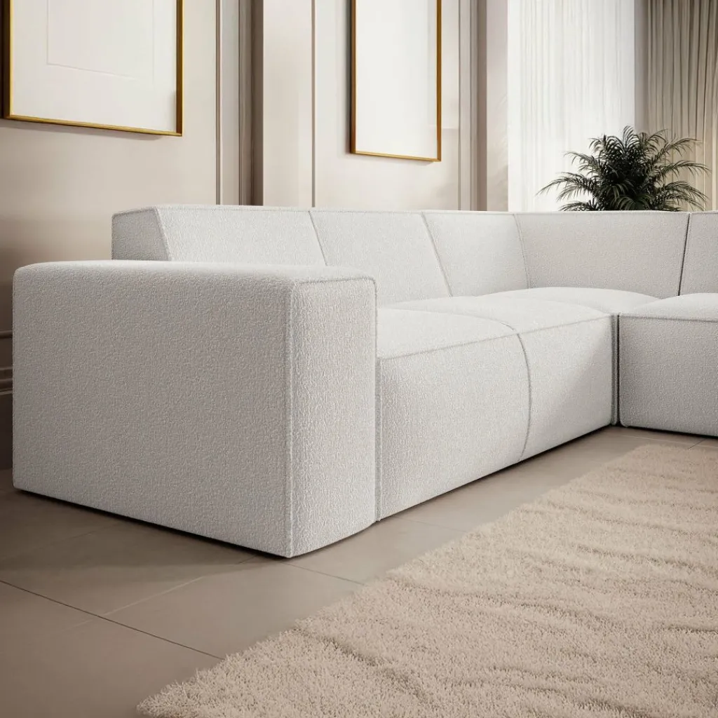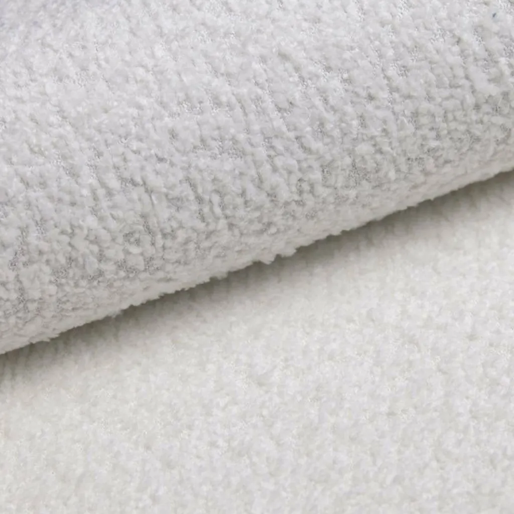 De hoekbank is bekleed met zachte teddystof in een lichte witte tint – een trendy en tijdloze keuze die direct sfeer toevoegt aan je woonkamer. De luxueuze boucléstructuur voelt zacht aan en zorgt voor extra comfort, terwijl de vaste rug- en zitkussens zorgen voor een strakke, opgeruimde look.
