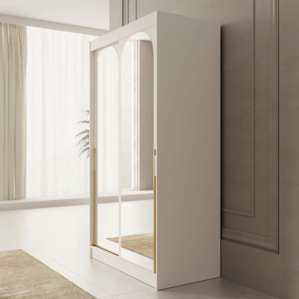 De Moniq kledingkast in wit heeft een frisse en neutrale uitstraling die goed past bij verschillende interieurstijlen. De twee schuifdeuren met spiegelpanelen zorgen voor extra licht in de kamer en laten de ruimte optisch groter lijken.